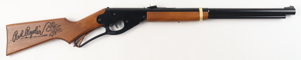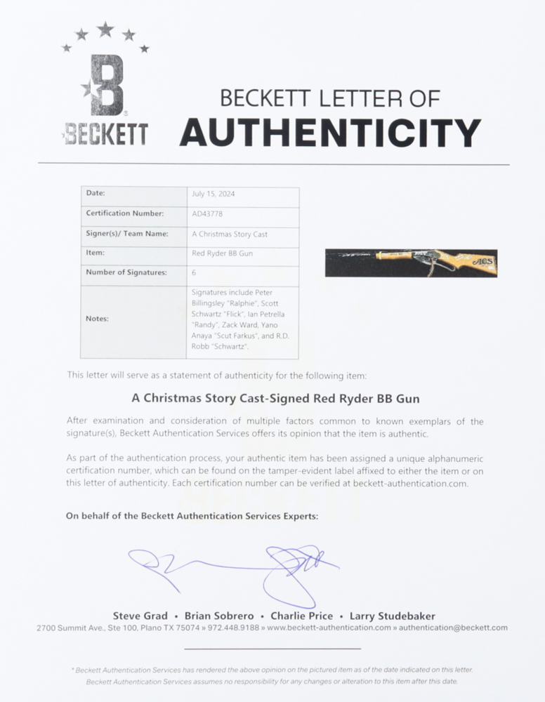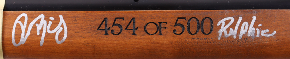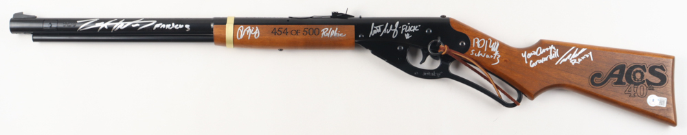 Daisy 650 Shot Red Ryder Carbine BB gun. Hand-signed and inscribed by (6) with Peter Billingsley (Ralphie), Zack Ward (Farkus), Scott Schwartz (Flick), R.D. Robb (Schwartz), Ian Petrella (Randy), and Yano Anaya (Grover Dill). The BB gun is limited edition and numbered #454/500.