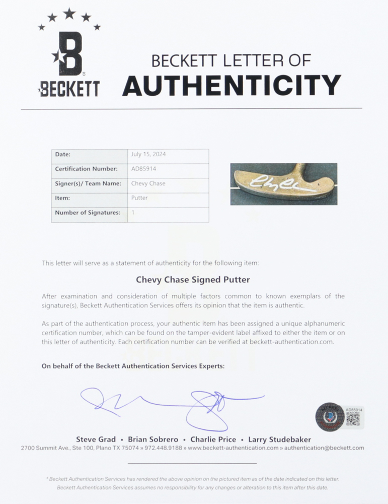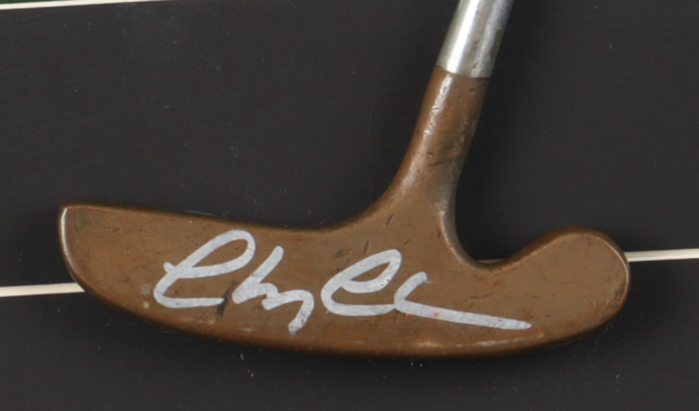 Custom frame measures approximately 19" x 27" in size and features a cut-down putter that has been hand-signed by Chevy Chase. Please note there are damages to the frame, see photos for more details.