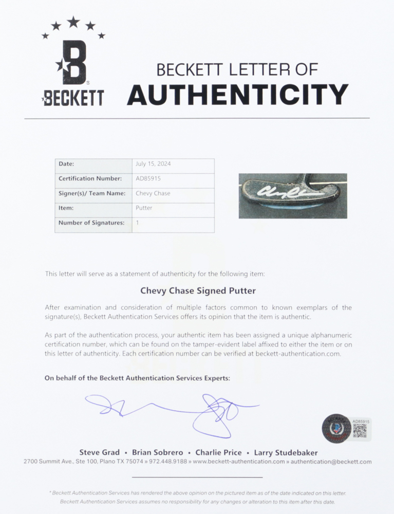 Custom frame measures approximately 20" x 28" in size and features a cut-down putter that has been hand-signed by Chevy Chase. Please note there is damages to the frame, see photos for more details.