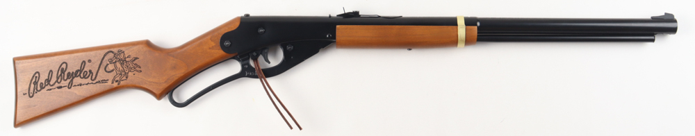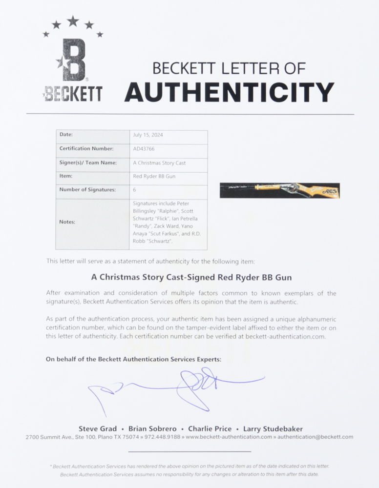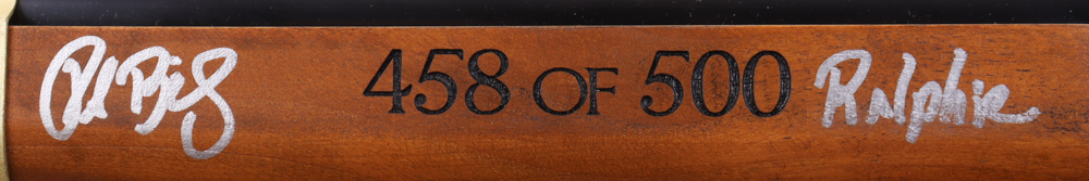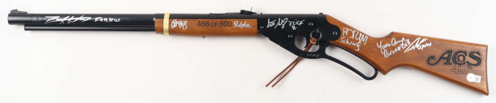 Daisy 650 Shot Red Ryder Carbine BB gun. Hand-signed and inscribed by (6) with Peter Billingsley (Ralphie), Zack Ward (Farkus), Scott Schwartz (Flick), R.D. Robb (Schwartz), Ian Petrella (Randy), and Yano Anaya (Grover Dill). The BB gun is limited edition and numbered #458/500.