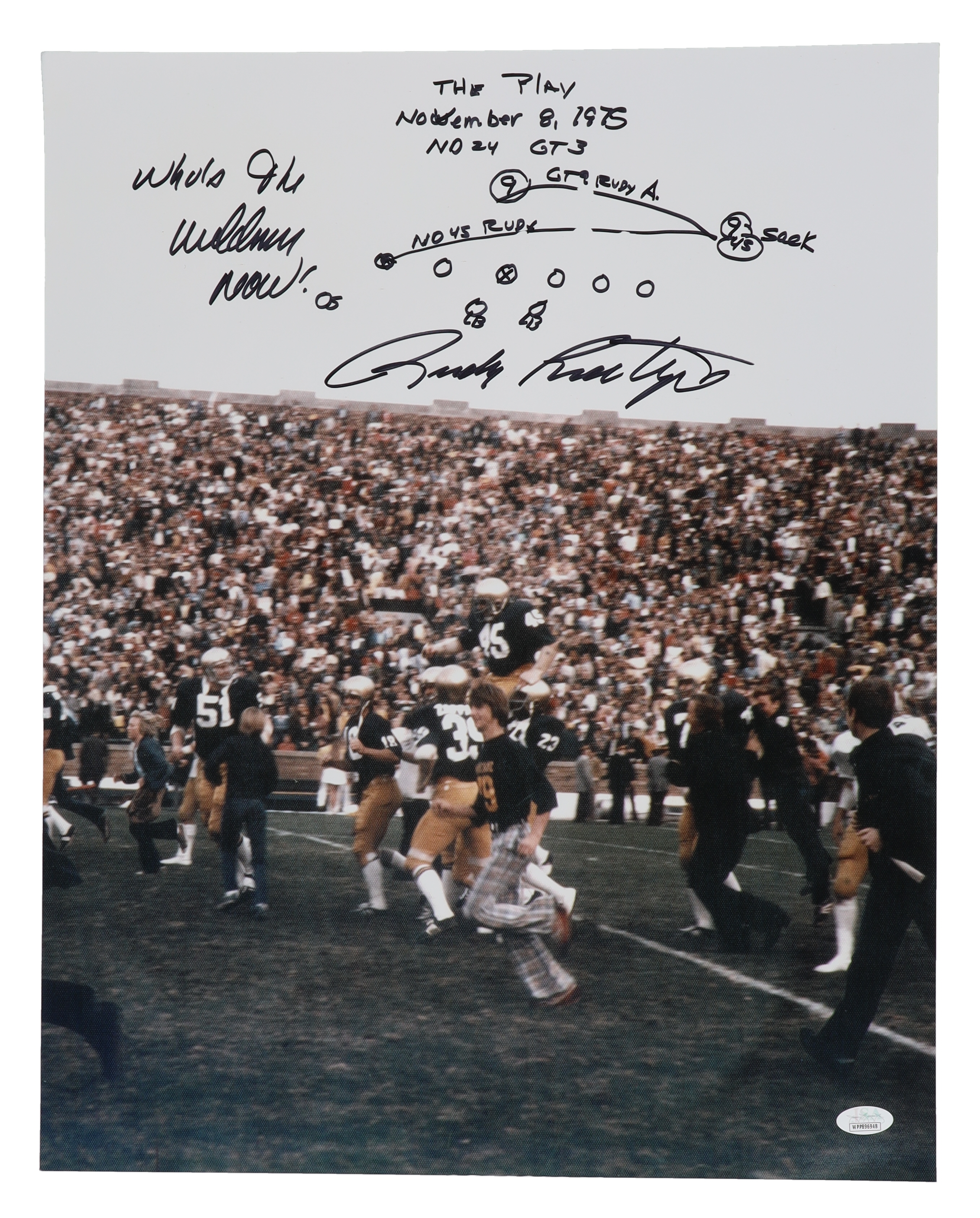 Photo measures 16" x 20" in size. Hand-signed, inscribed, and sketched by Rudy Ruettiger.