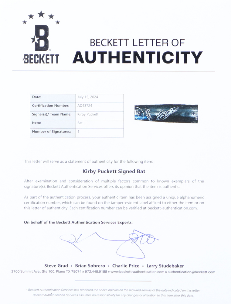 Kirby Puckett Signed Louisville Slugger Player Model Baseball Bat (Beckett)