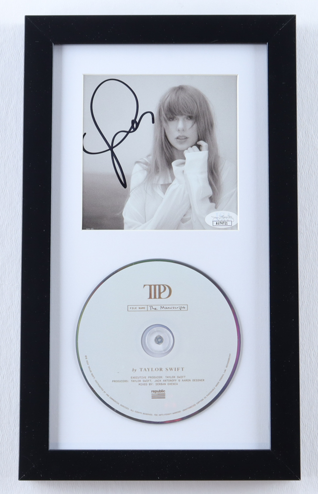 Custom frame measures approximately 8" x 13.5" in size. Features a "The Torture Poets Department" CD insert that has been hand-signed by Taylor Swift and includes the disc as shown. Please note, there is some scuffing on the frame.
