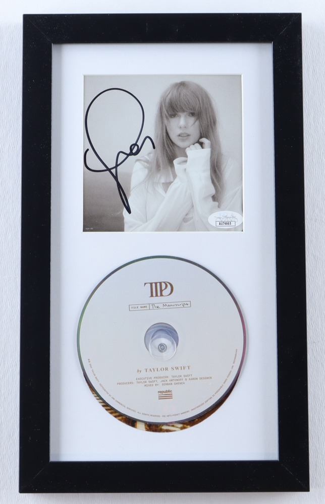 Custom frame measures approximately 8" x 13.5" in size. Features a "The Torture Poets Department" CD insert that has been hand-signed by Taylor Swift and includes the disc as shown. Please note, there is some scuffing on the frame.