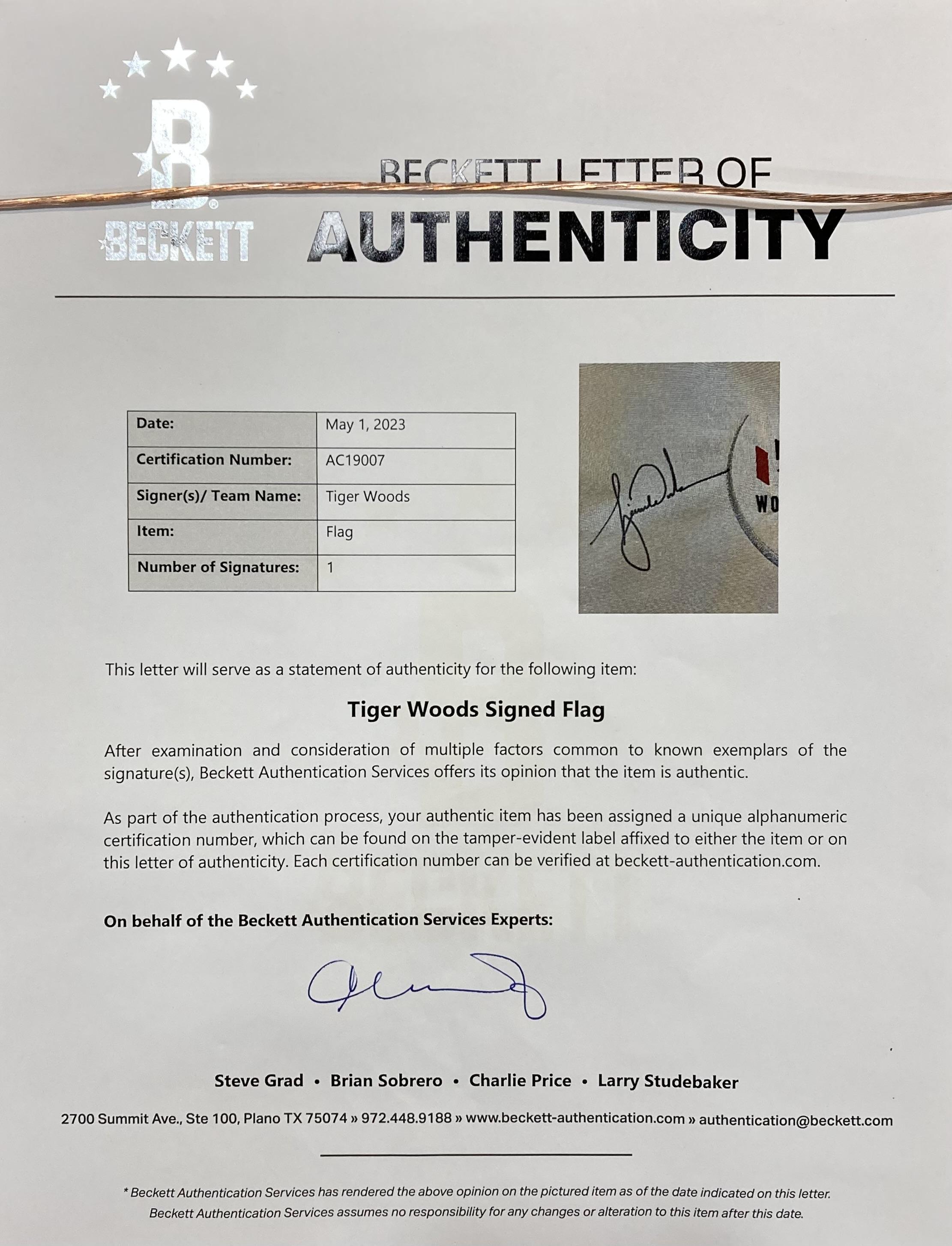 Custom frame measures 22” x 27” in size and features a golf flag that has been hand-signed by Tiger Woods (HOF).