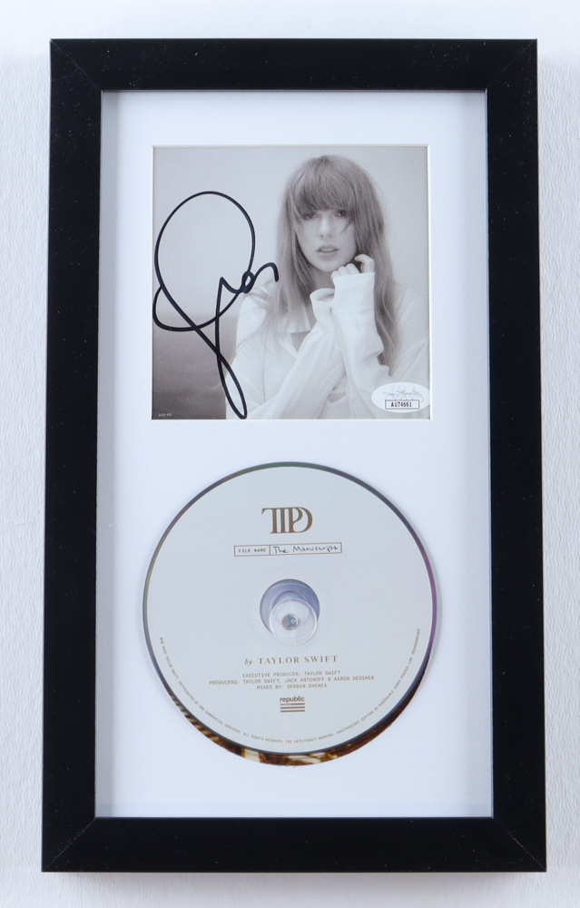Custom frame measures approximately 8" x 13.5" in size. Features a "The Torture Poets Department" CD insert that has been hand-signed by Taylor Swift and includes the disc as shown. Please note, there is scuffing on the frame.