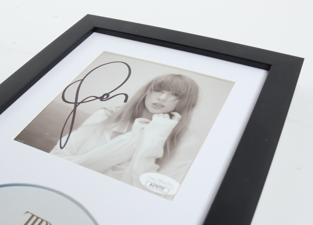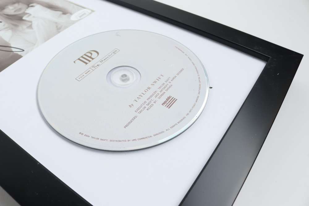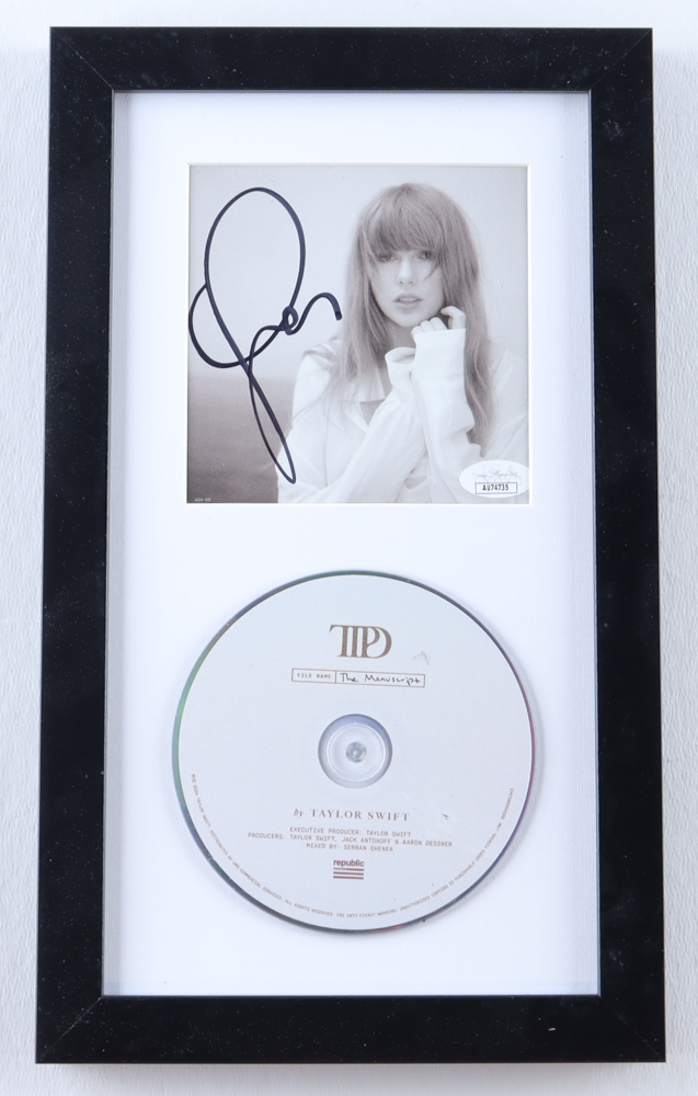 Custom frame measures approximately 8" x 13.5" in size. Features a "The Torture Poets Department" CD insert that has been hand-signed by Taylor Swift and includes the disc as shown. Please note, there is scuffing throughout the frame and there is no plexiglass cover.