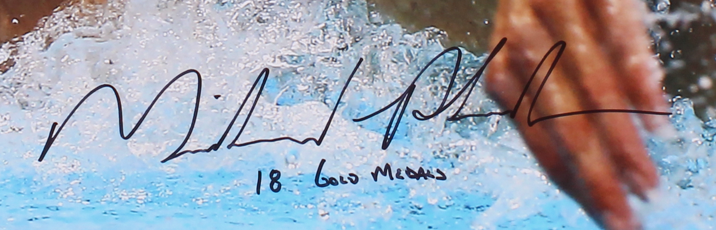 Photo measures 16" x 20" in size and has been hand-signed and inscribed in black felt-tip pen by Michael Phelps.