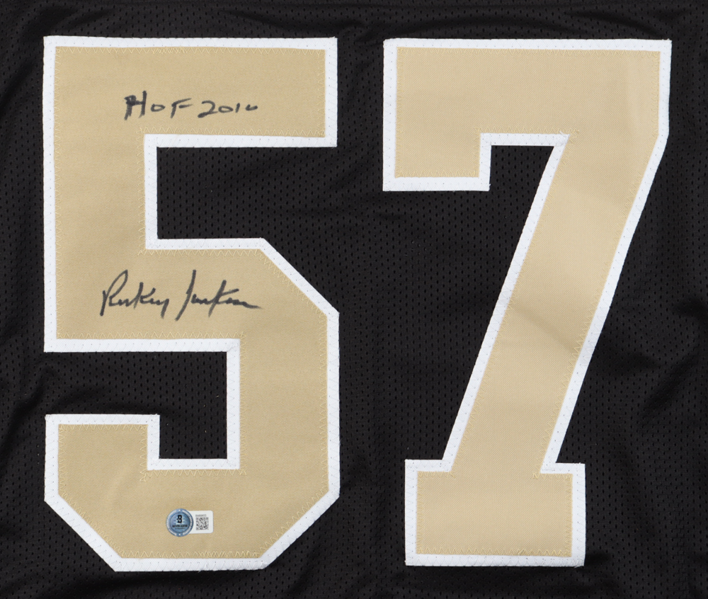 Custom jersey. Everything is sewn on, size XL. Hand-signed and inscribed by Rickey Jackson (HOF).