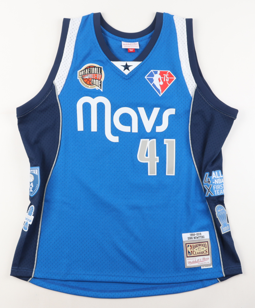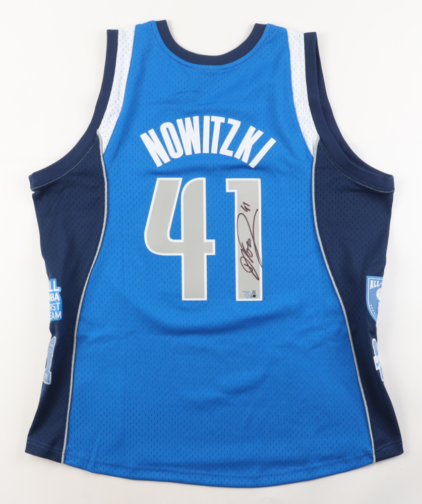 Mitchell & Ness throwback jersey with everything pressed on, size XL. Hand-signed by Dirk Nowitzki (Dallas Mavericks, HOF). Please note, the signature has bled.