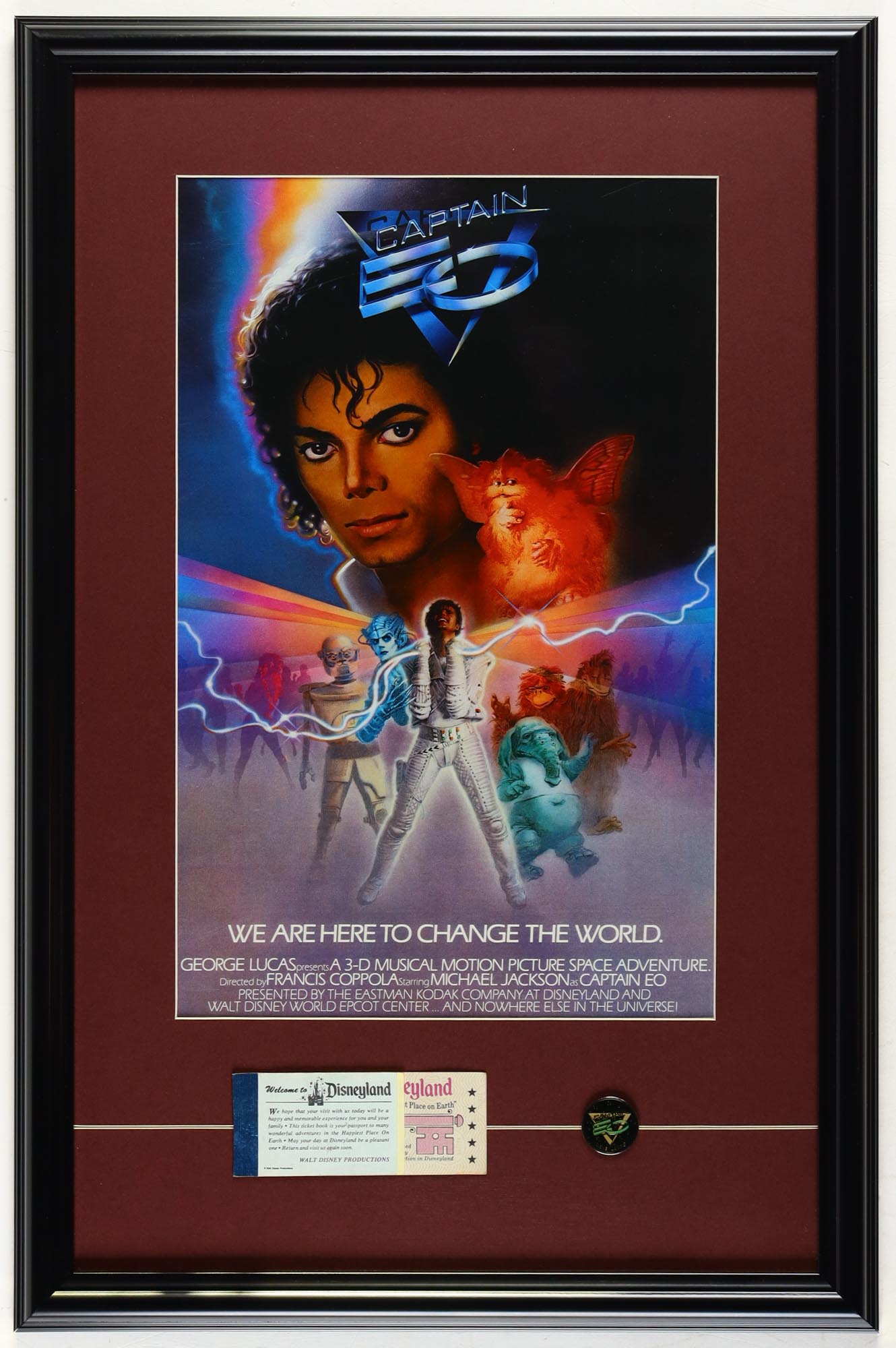 Custom frame measures approximately 17.25" x 26" in size and features a print from Michael Jackson's "Captain EO" ride. Display also includes a Vintage Disneyland Ticket Book and vintage Lapel Pin. Please note, the display is unsigned.