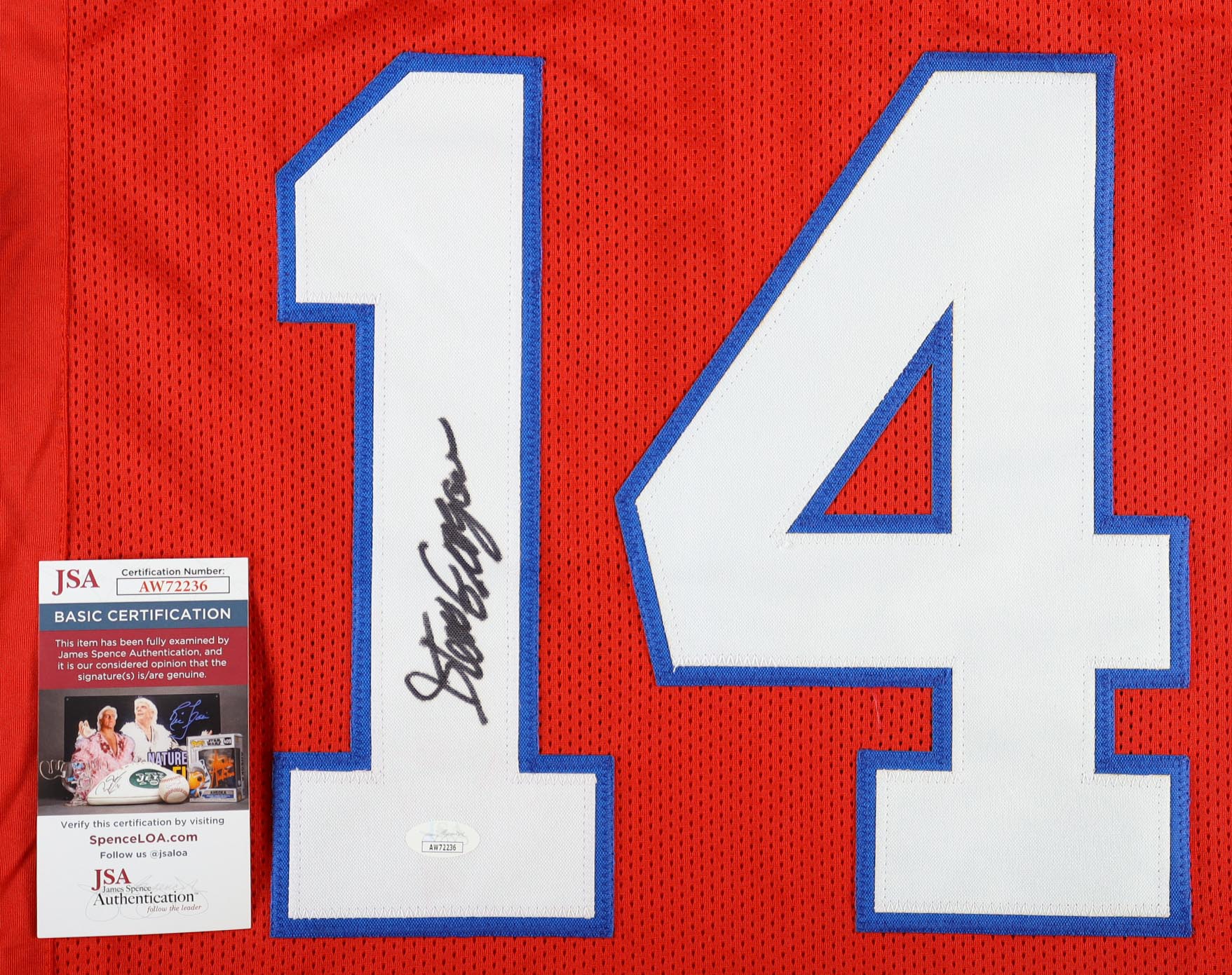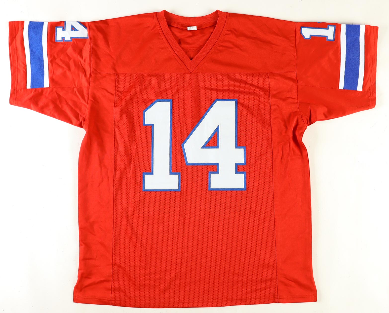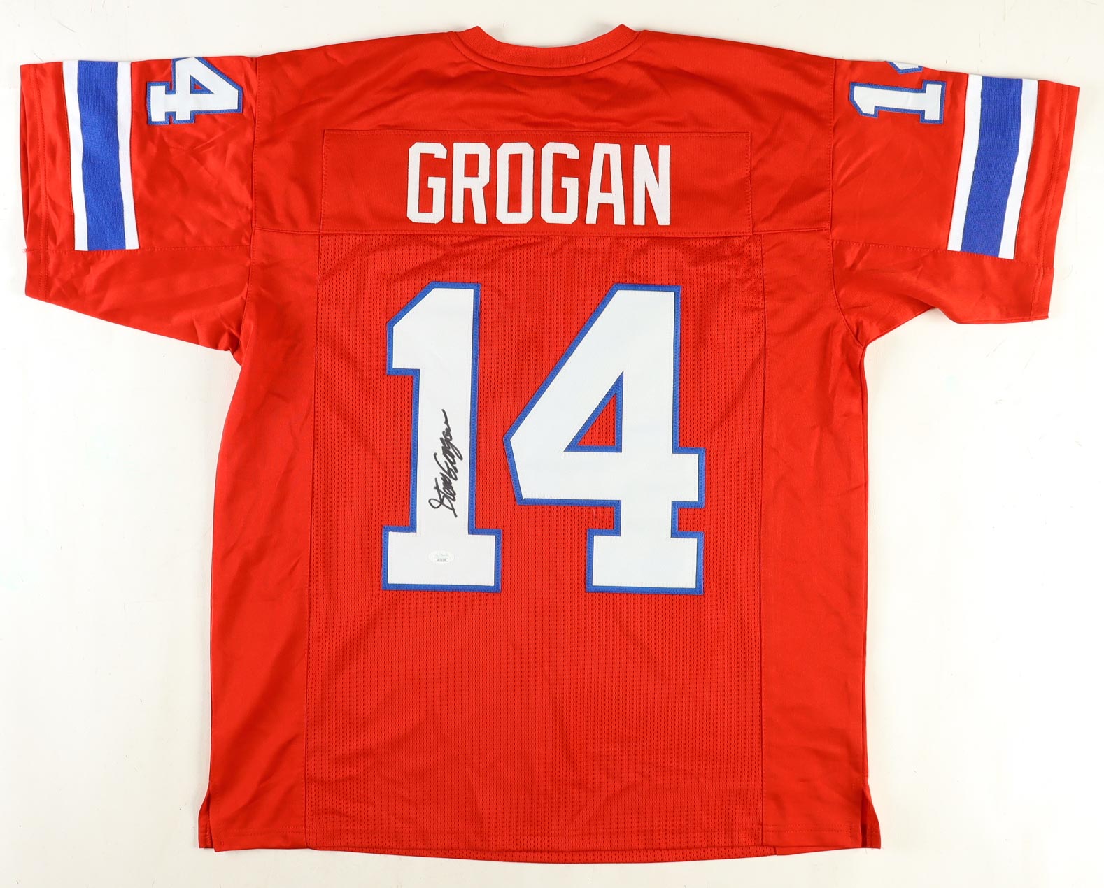Custom jersey. Everything is sewn on, size XL. Hand-signed by Steve Grogan. Please note, the signature has bled.
