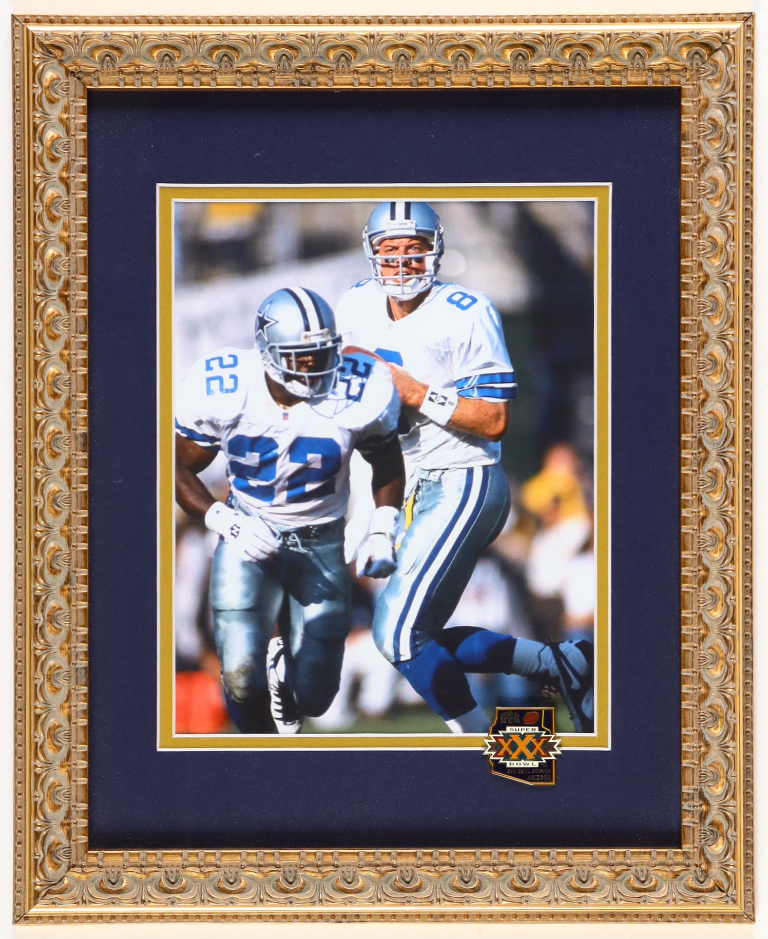 Custom frame display measures approximately 13.25" x 16.25" in size. Features an unsigned photo of Troy Aikman (Dallas Cowboys, HOF) and Emmitt Smith (Dallas Cowboys, HOF). Includes Official Super Bowl XXX pin. Please note, the display is unsigned.