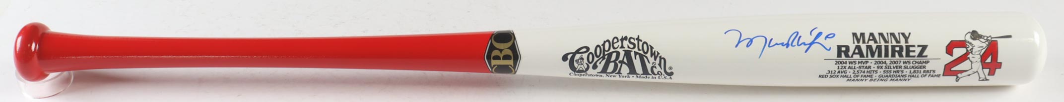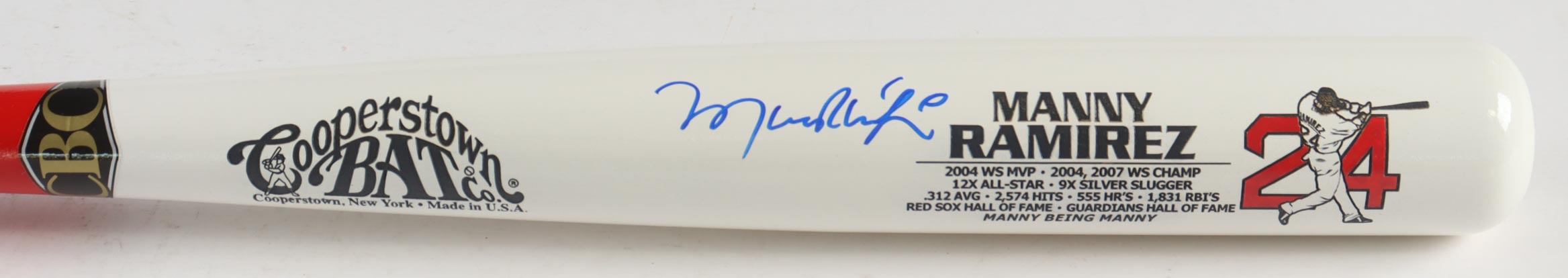 Cooperstown Bat Co.Career Stat baseball bat has been hand-signed by Manny Ramirez (Boston Red Sox).