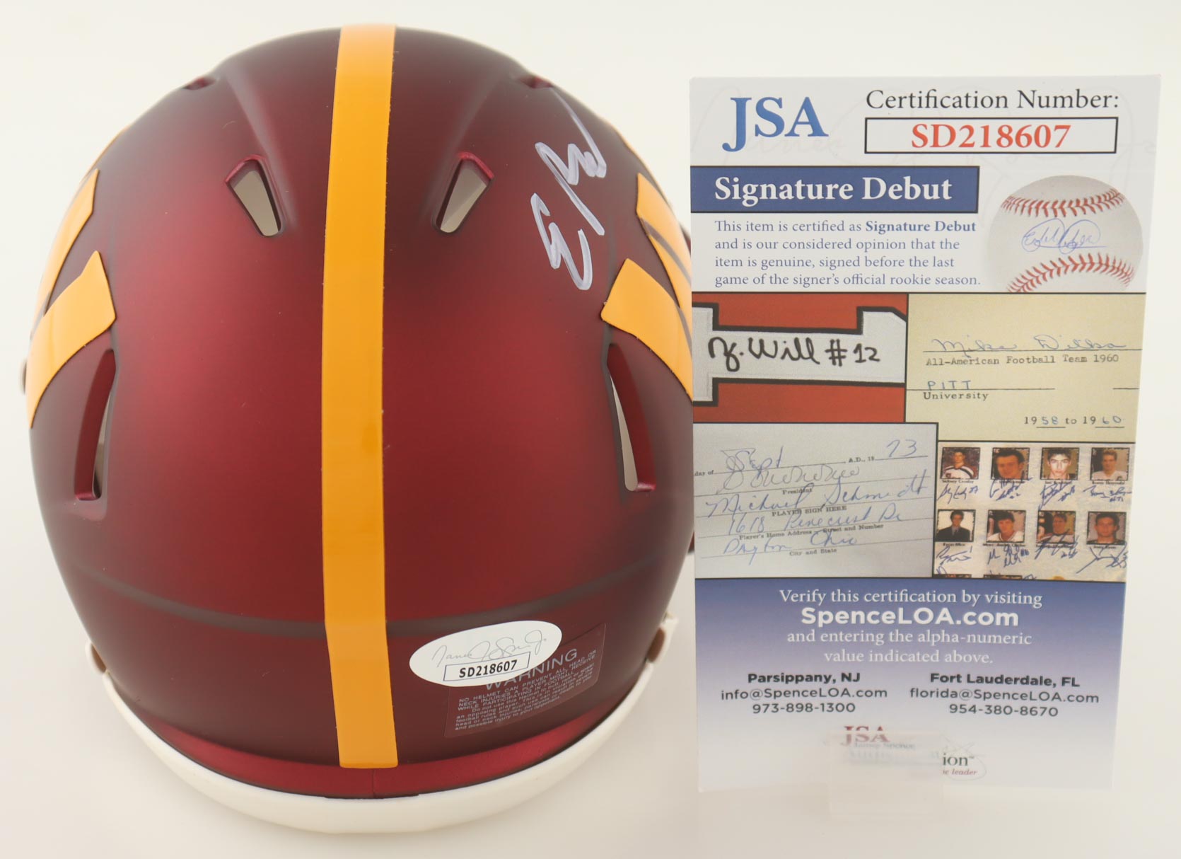 The autograph(s) includes an official James Spence Authentication (JSA) "Signature Debut" hologram and COA. "Signature Debut" is the autographed memorabilia equivalent to a rookie card. The JSA definition of a "Signature Debut" is as follows: "Any item that is autographed and received by JSA prior to the last game of the signer's official rookie season.