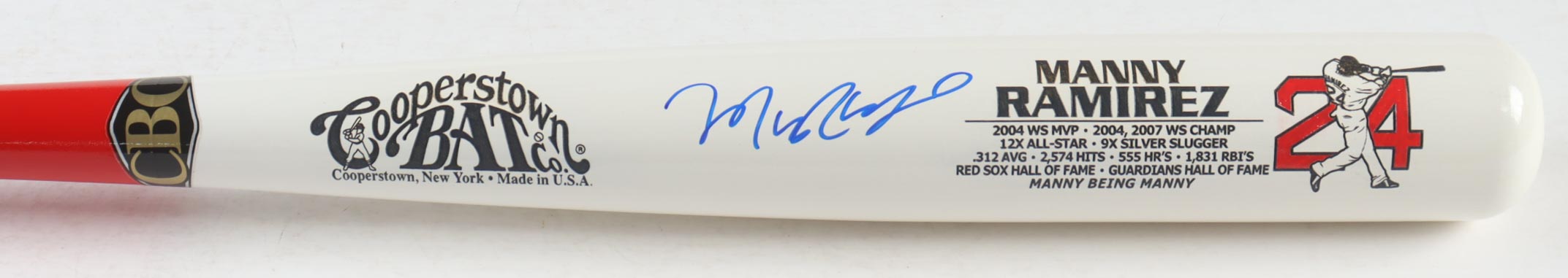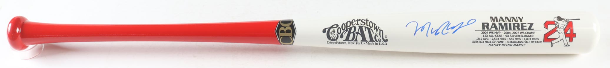Cooperstown Bat Co.Career Stat baseball bat has been hand-signed by Manny Ramirez (Boston Red Sox).
