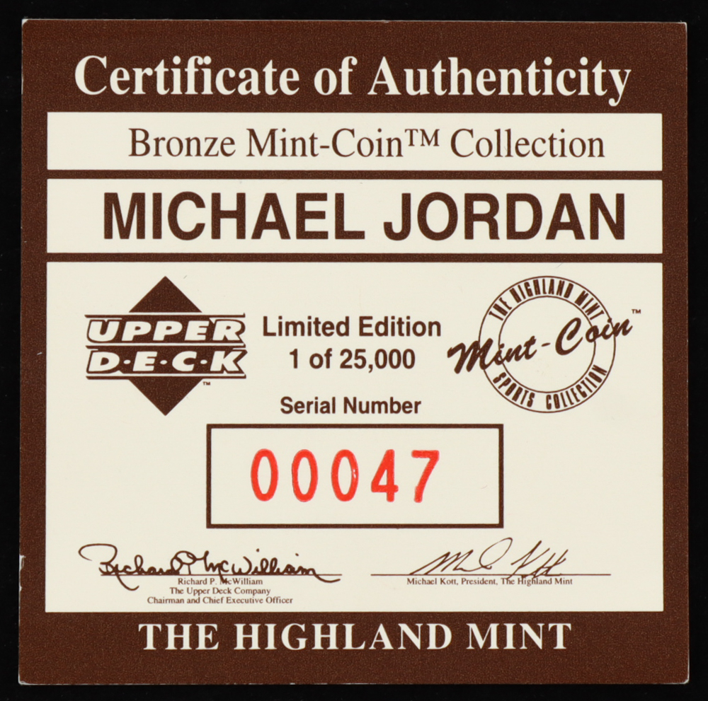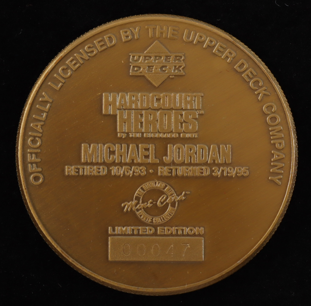 1995 Upper Deck Highland Mint bronze medallion featuring Michael Jordan (Chicago Bulls, HOF). This coin is Limited Edition and has been numbered #47/20,000. Please see photos for more details on the condition of the round.