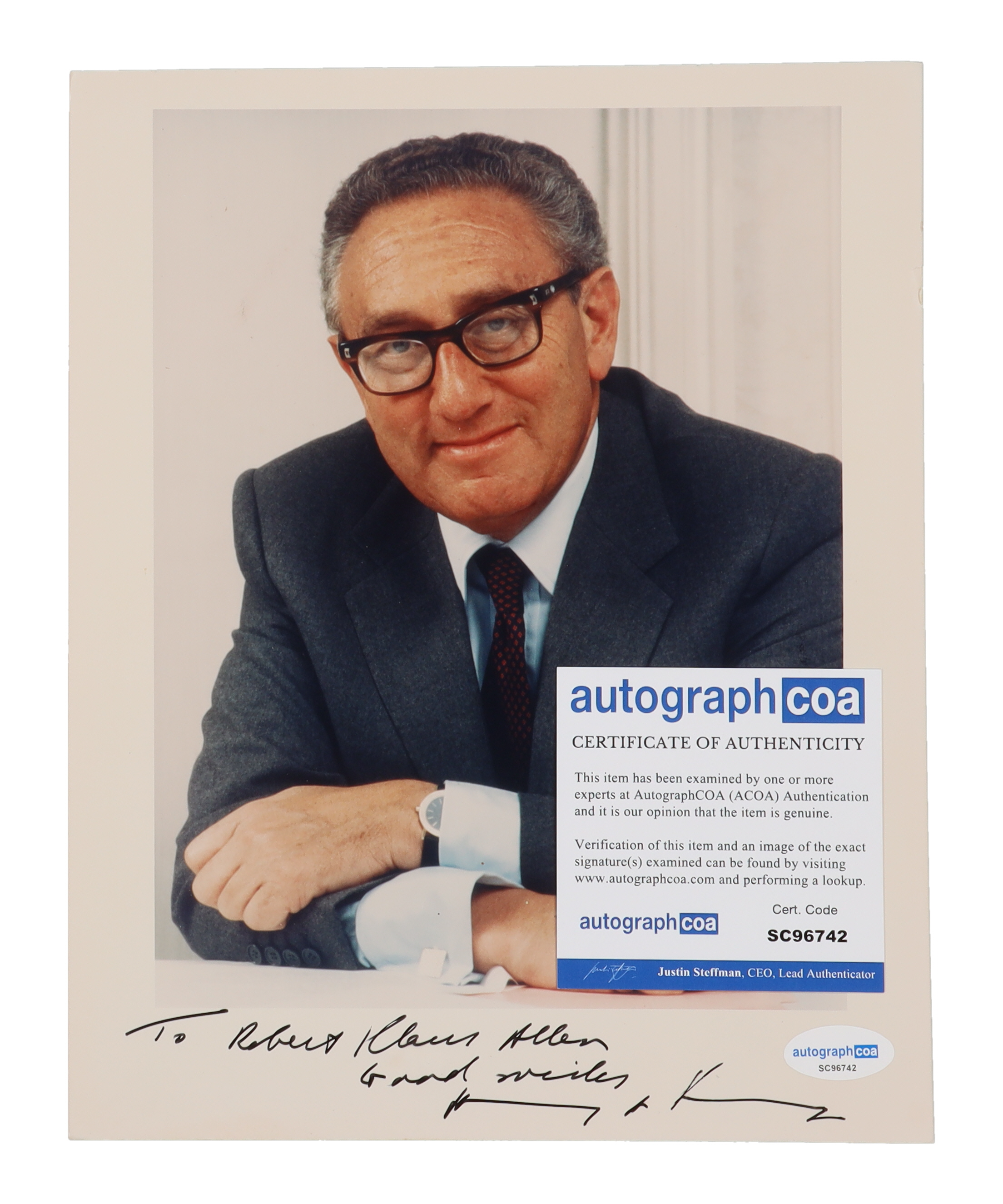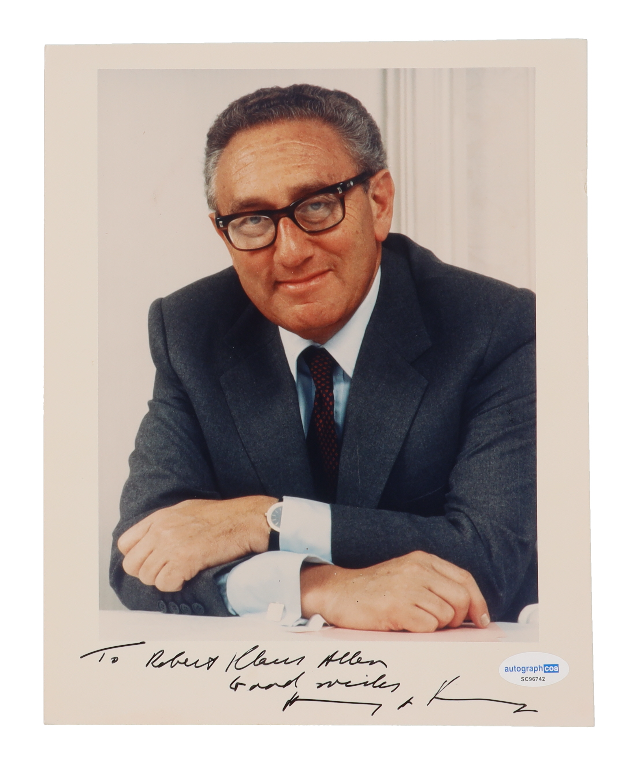 Photo measures 8" x 10" in size and has been hand-signed and inscribed by Henry Kissinger (D. 2023). Please note, the inscription has been personalized to "Robert Clause Allen".