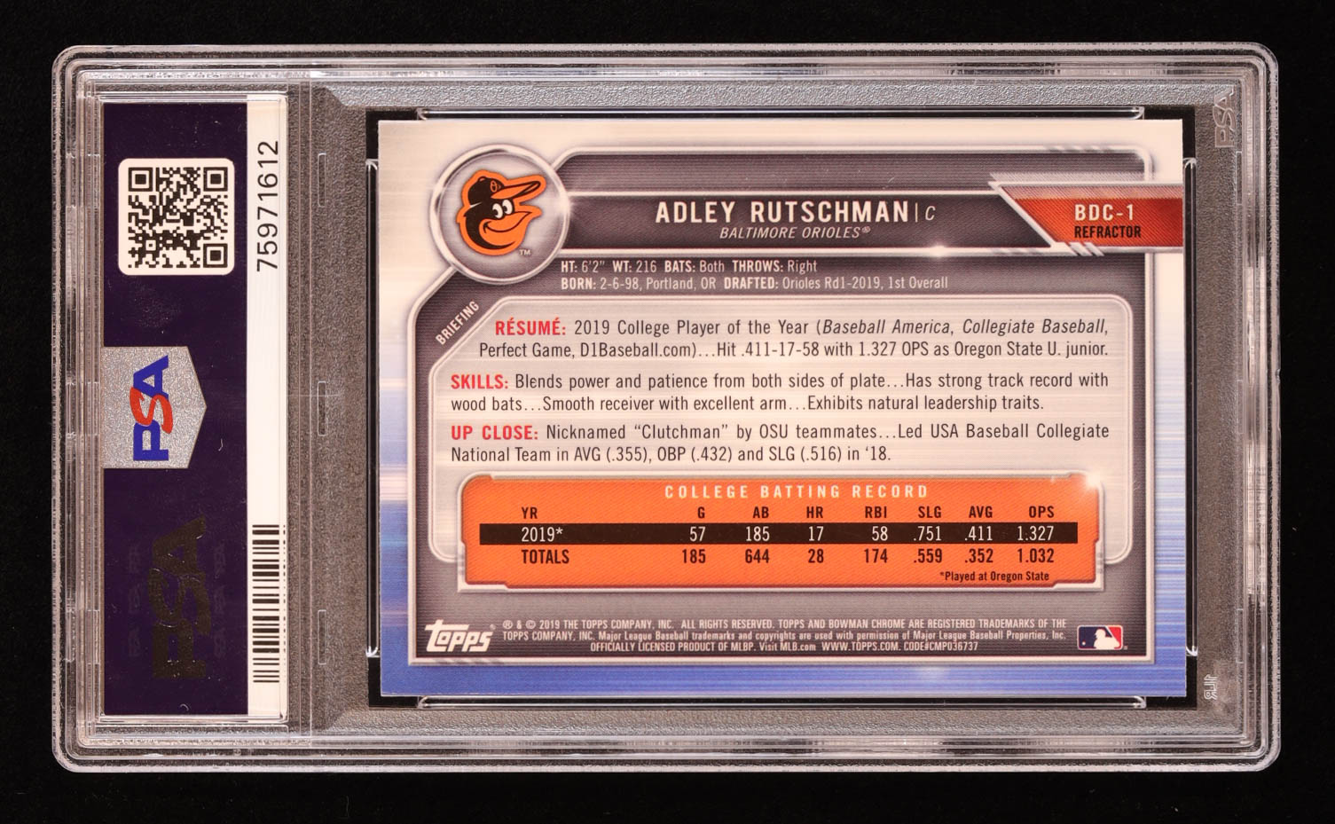 Adley Rutschman 2019 Bowman Chrome Draft Refractors #BDC1 RC (PSA 10)