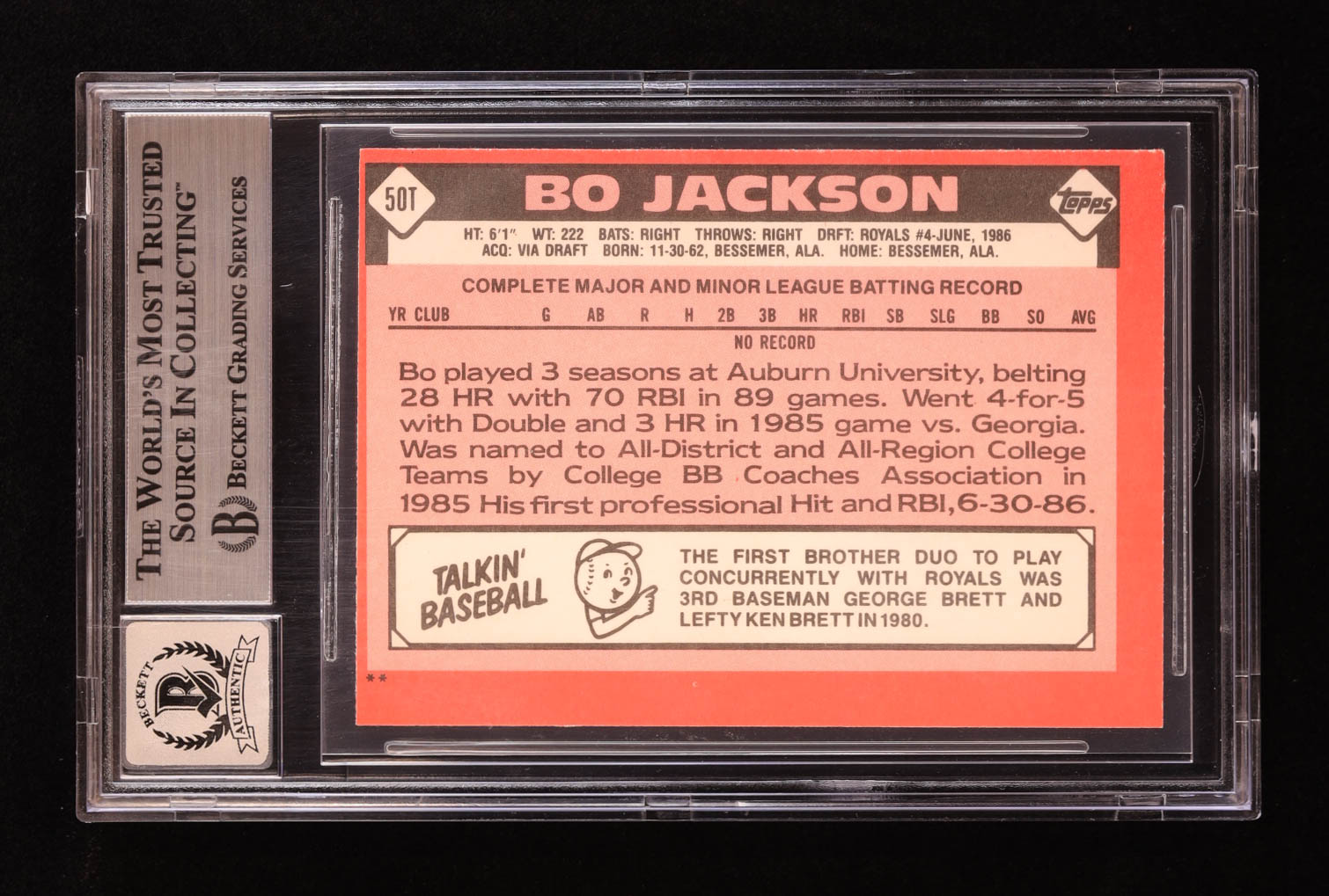 Bo Jackson Signed 1986 Topps Traded #50T XRC (BGS | Auto 10)