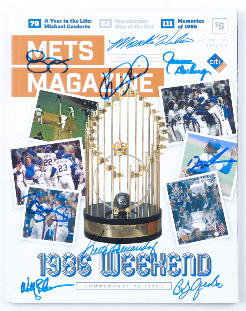 May 27, 2016 Mets Magazine which features the 1986 New York Mets has been hand-signed by Kevin Mitchell, Mookie Wilson, Ron Darling, Dwight Gooden, Darryl Strawberry, Wally Backman, Bob Ojeda, Sid Fernandez. Please note, there is bent corners on the magazine, see photos for more details.