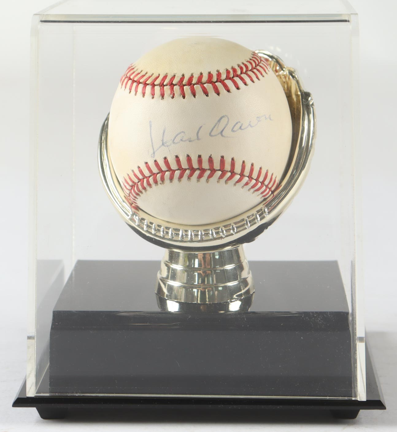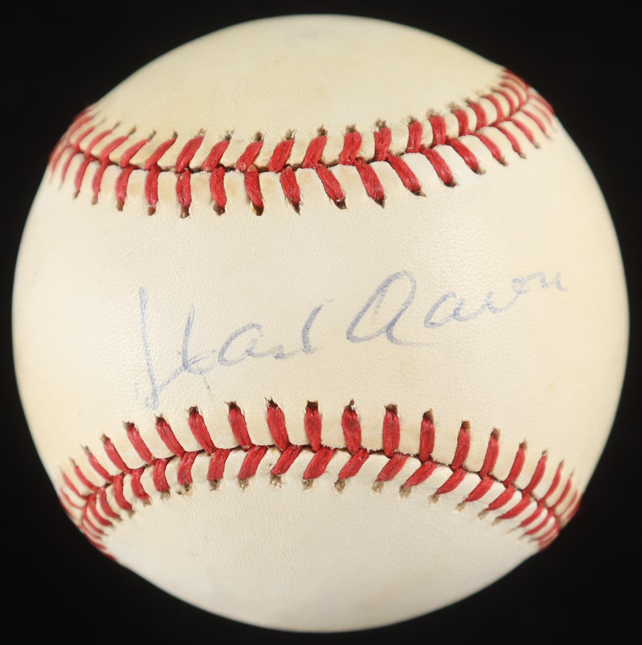 Rawlings Official National League baseball. Hand-signed by Hank Aaron (D. 2021, Atlanta Braves, HOF). The display case is included as shown. Please note, the ball is naturally toned.