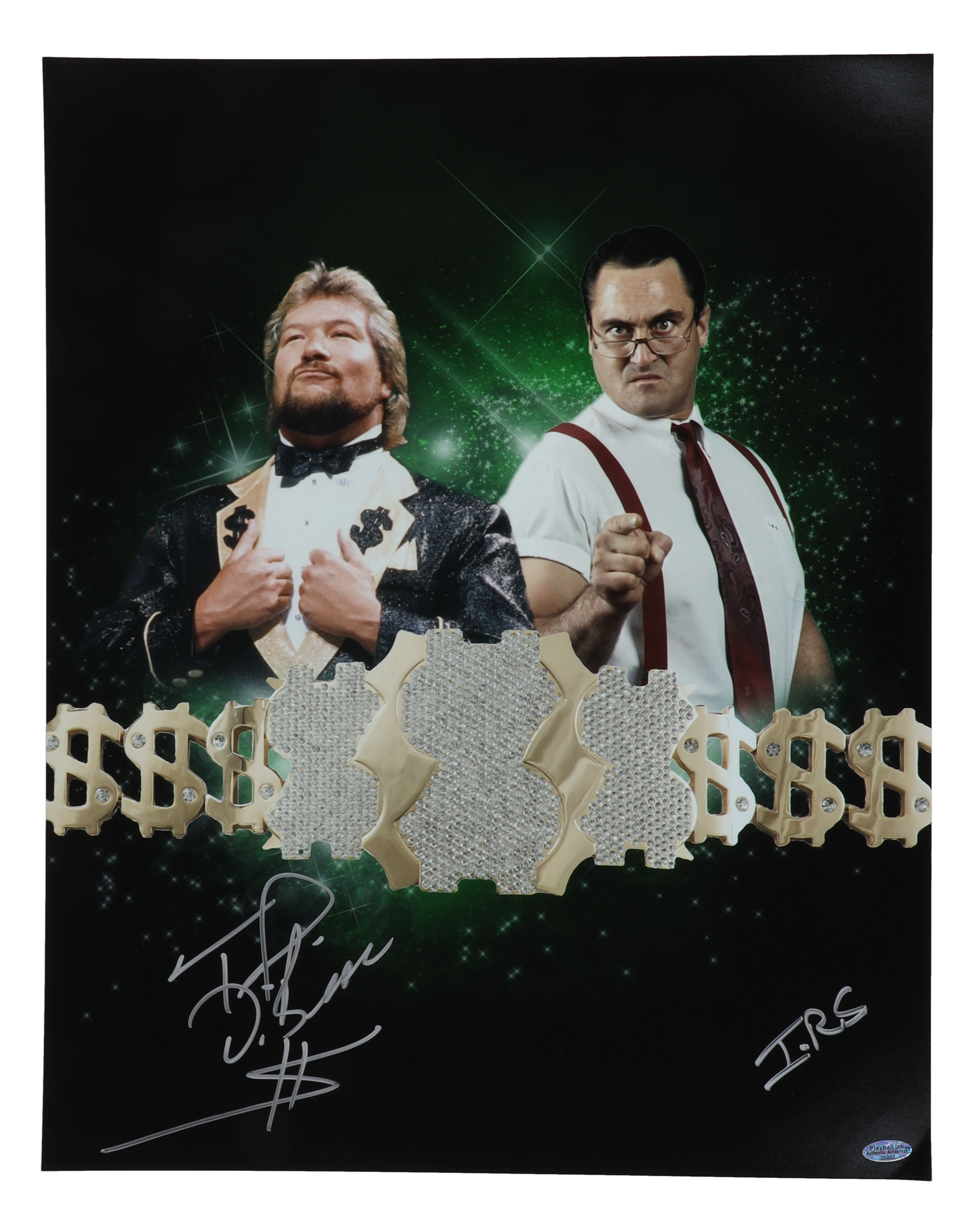 Photo measures 16" x 20" in size and has been hand-signed by Ted DiBiase (The Million Dollar Man, HOF) and Mike Rotunda (I.R.S., HOF). Please note, the bottom right corner is creased.