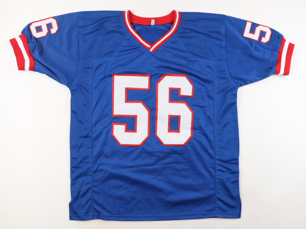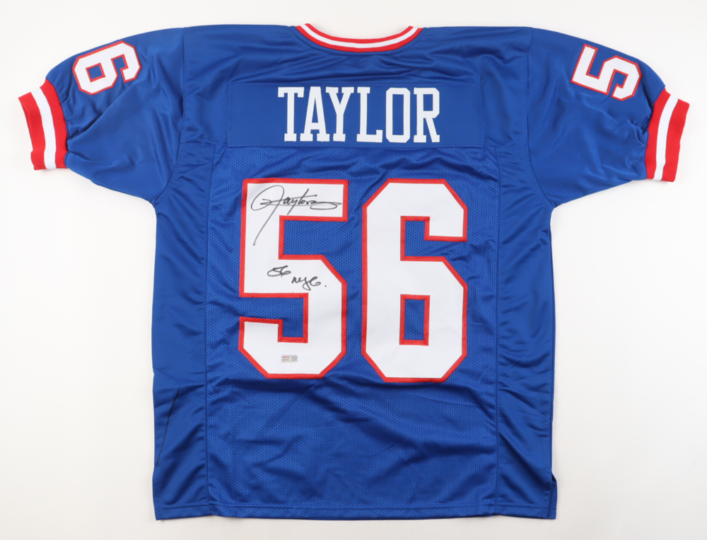 Custom jersey with everything sewn own, size XL. Hand-signed and inscribed by Lawrence Taylor (HOF). Please note that there is a pen mark on the reverse-left side of the jersey along the lining.