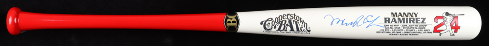 Cooperstown Bat Co.Career Stat baseball bat has been hand-signed by Manny Ramirez (Boston Red Sox).
