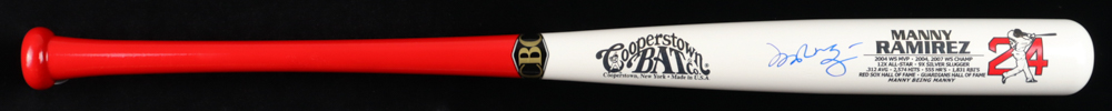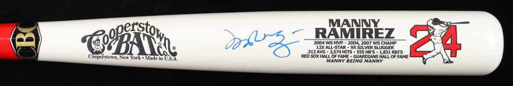 Cooperstown Bat Co.Career Stat baseball bat has been hand-signed by Manny Ramirez (Boston Red Sox).