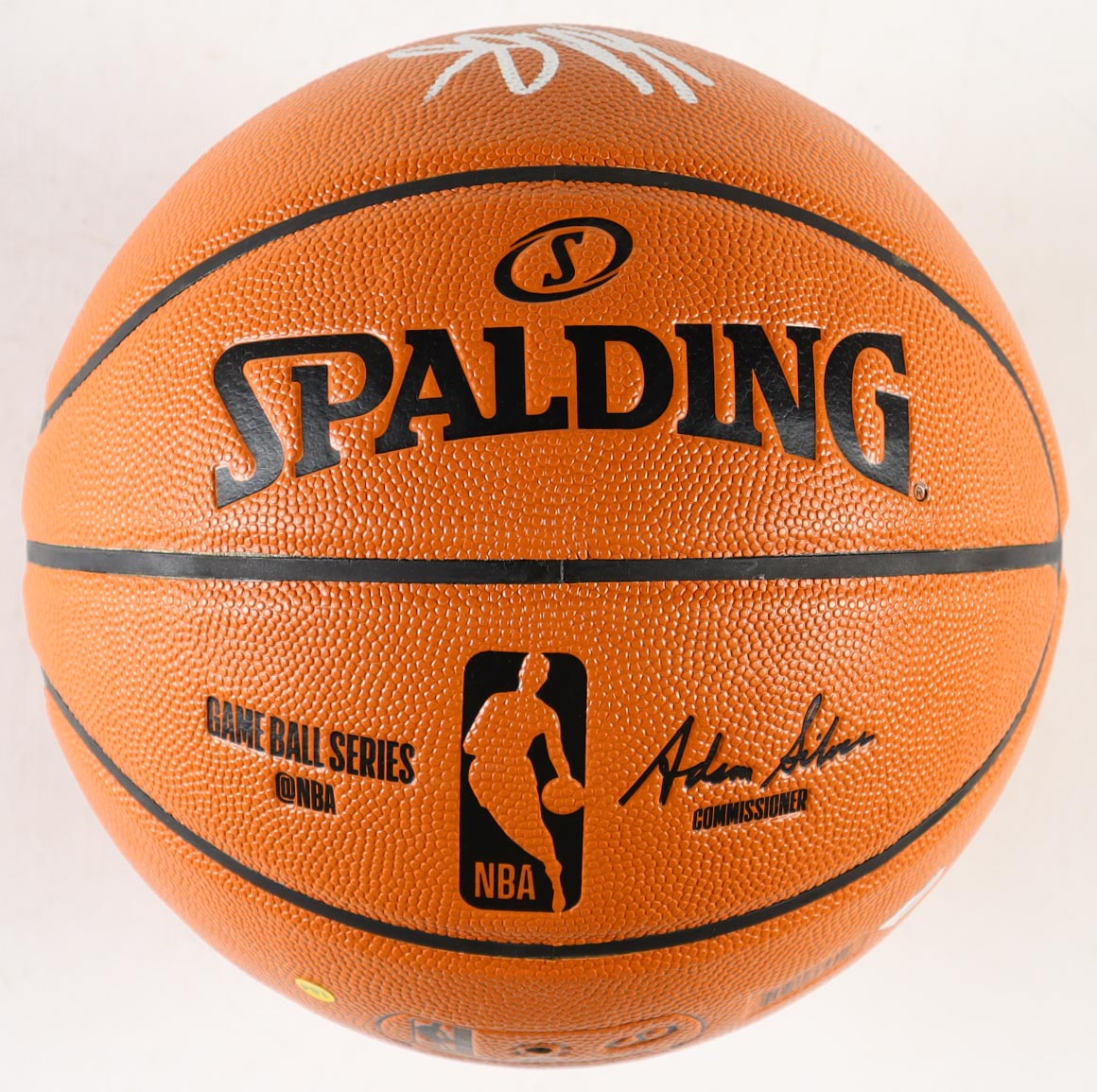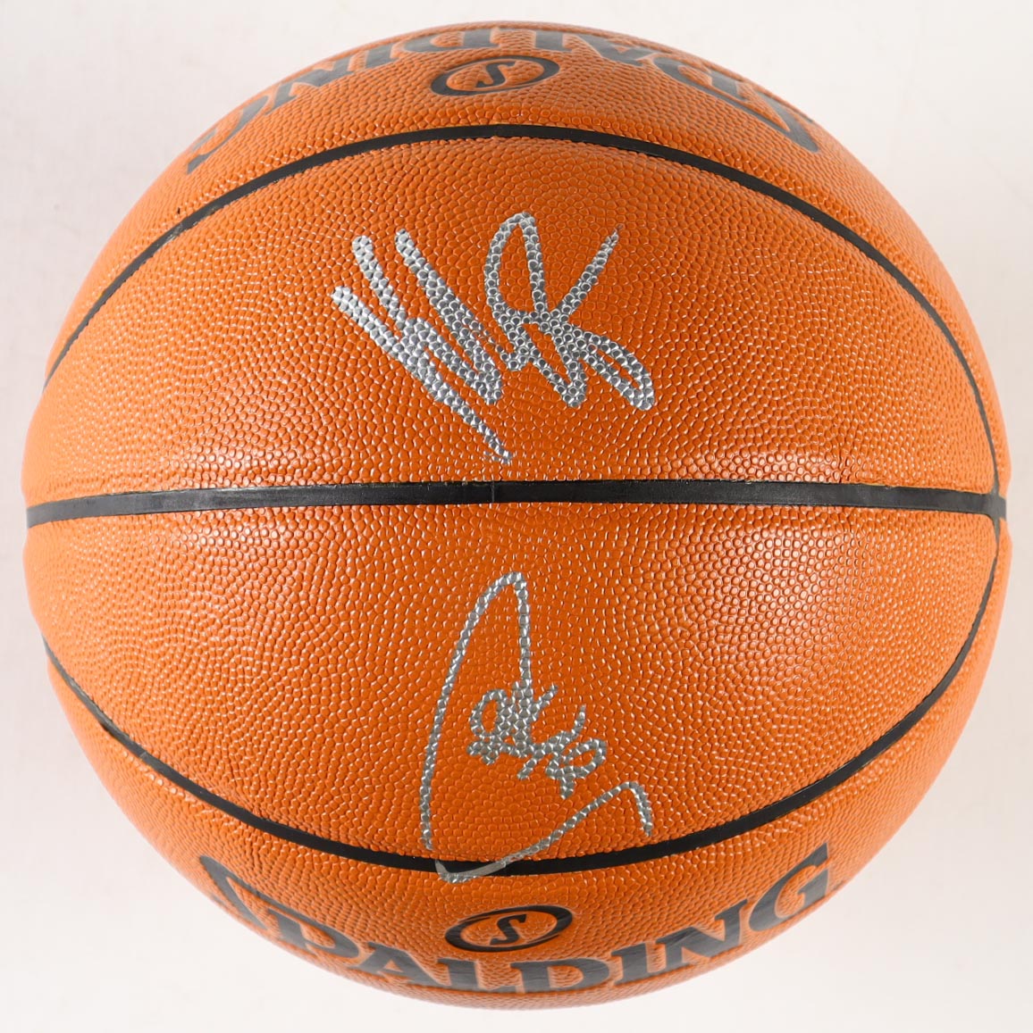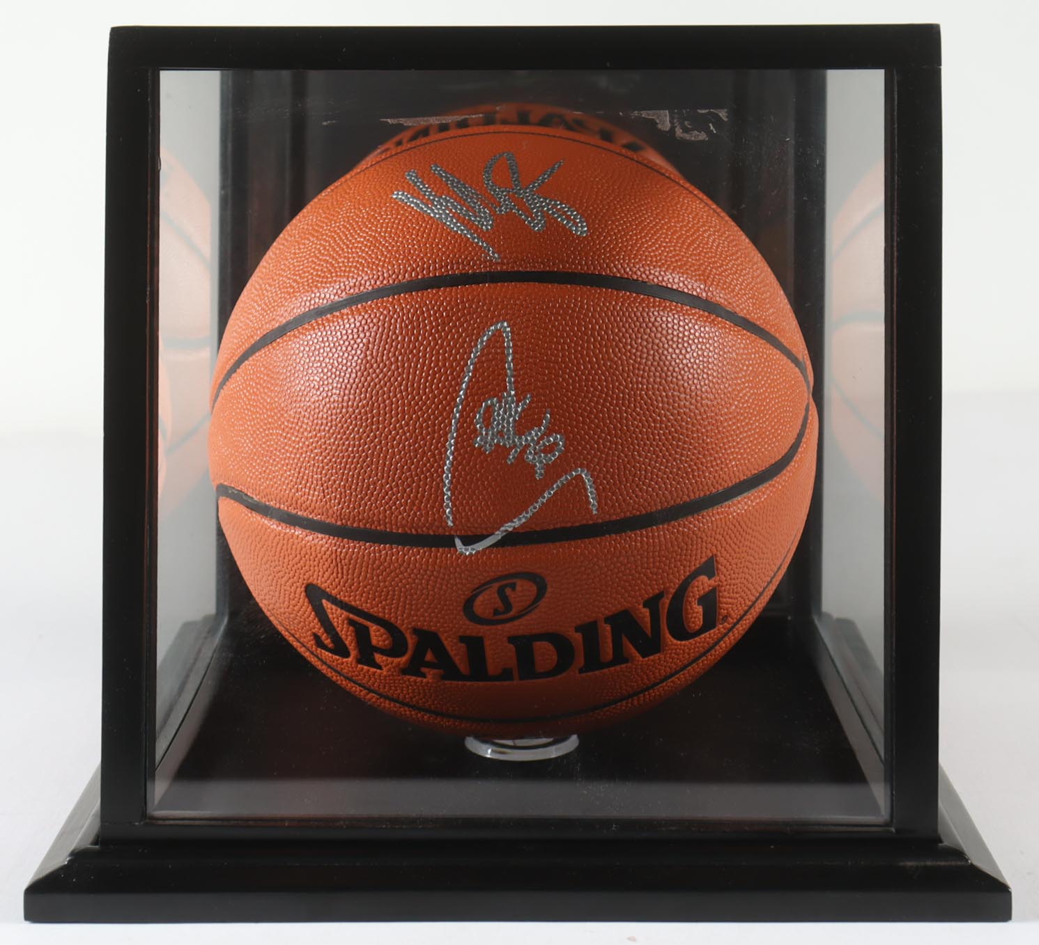 Spalding Game Ball Series Basketball. Hand-signed by Stephen Curry (Golden State Warriors) and Klay Thompson (Golden State Warriors). The display case is included as shown.