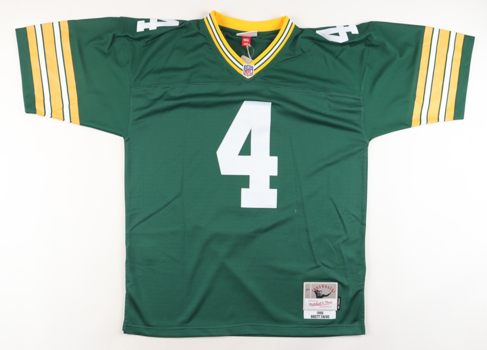 Mitchell & Ness jersey, everything is sewn on, size 44 (L). Hand-signed by Brett Favre (Green Bay Packers, HOF). Please note, there is residue on the right sleeve.