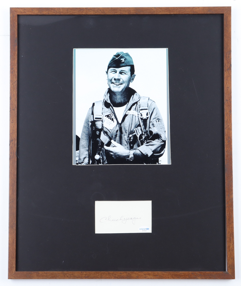 Custom frame measures approximately 18" x 23" in size. Features a cut hand-signed by Chuck Yeager (D. 2020). Please note, there are scratches and scuffing on the display.