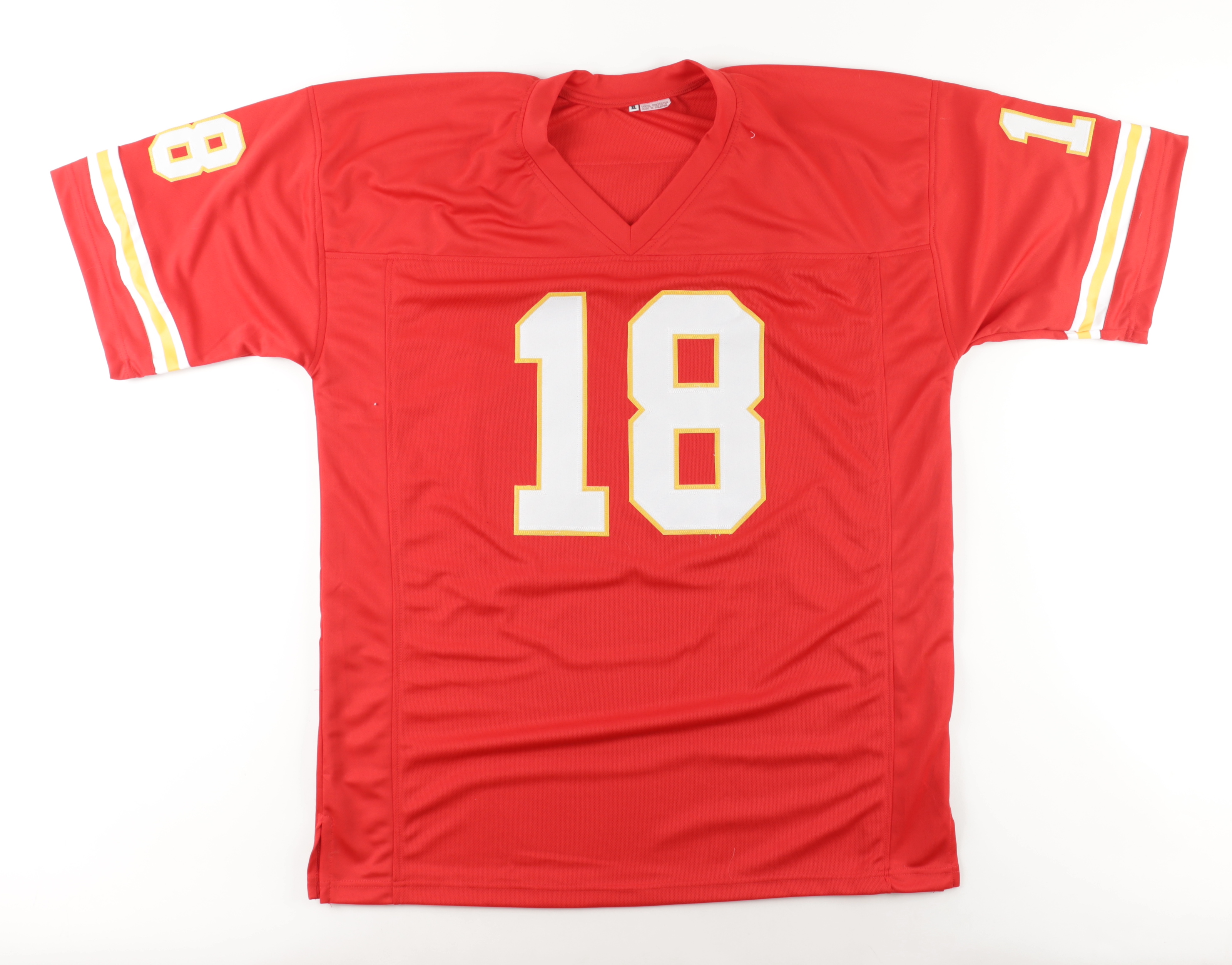 Custom jersey. Everything sewn on, size XL. Has been hand-signed by Emmitt Thomas (HOF).