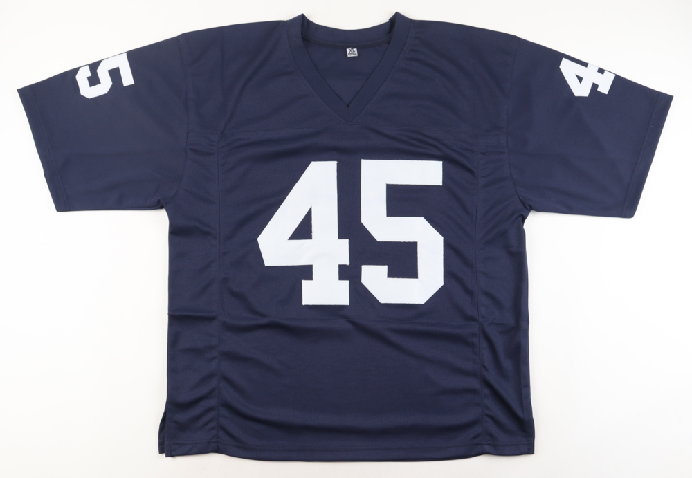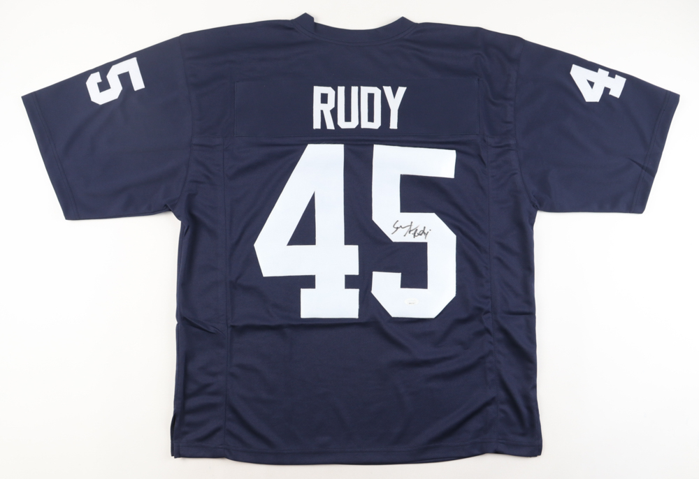Custom jersey with everything sewn on, size XL. Hand-signed and inscribed by Sean Astin (Rudy). Please note, the jersey is not signed by Rudy Ruettiger.