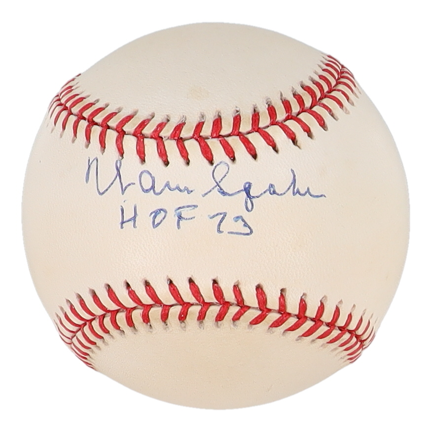 Warren Spahn Signed ONL Baseball Inscribed "HOF 73" (JSA)