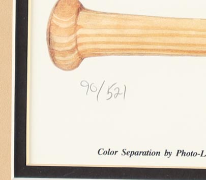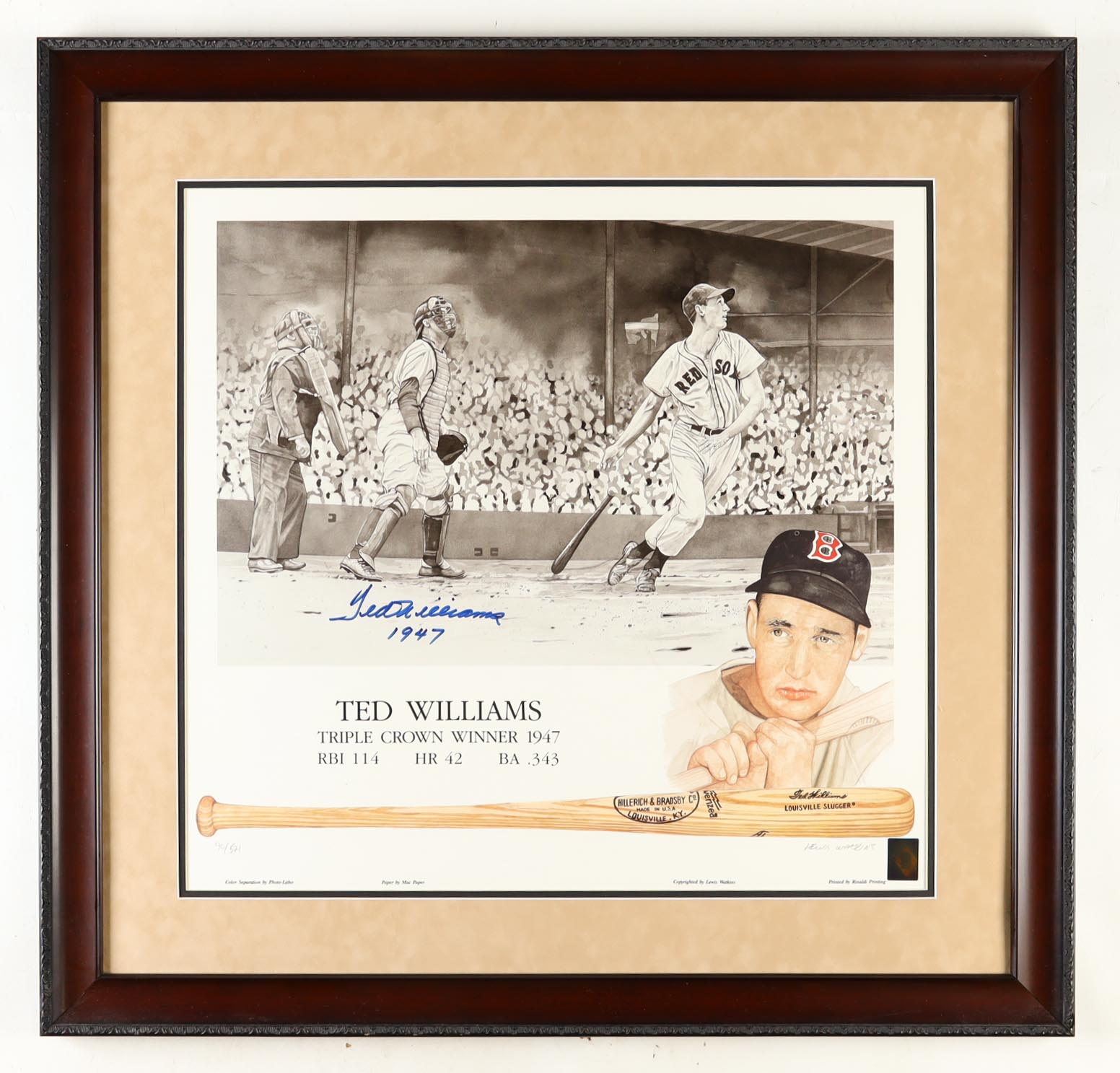 Custom frame measures 32" x 33" in size. Features a print numbered #90/521 that has been hand-signed and inscribed by Ted Williams (D. 2002, Boston Red Sox, HOF). The print is also signed by an unknown hand.
