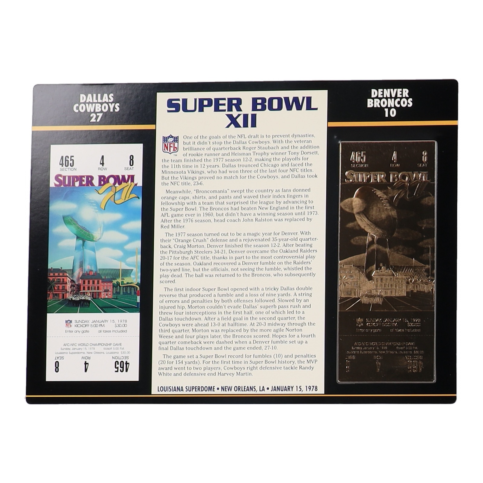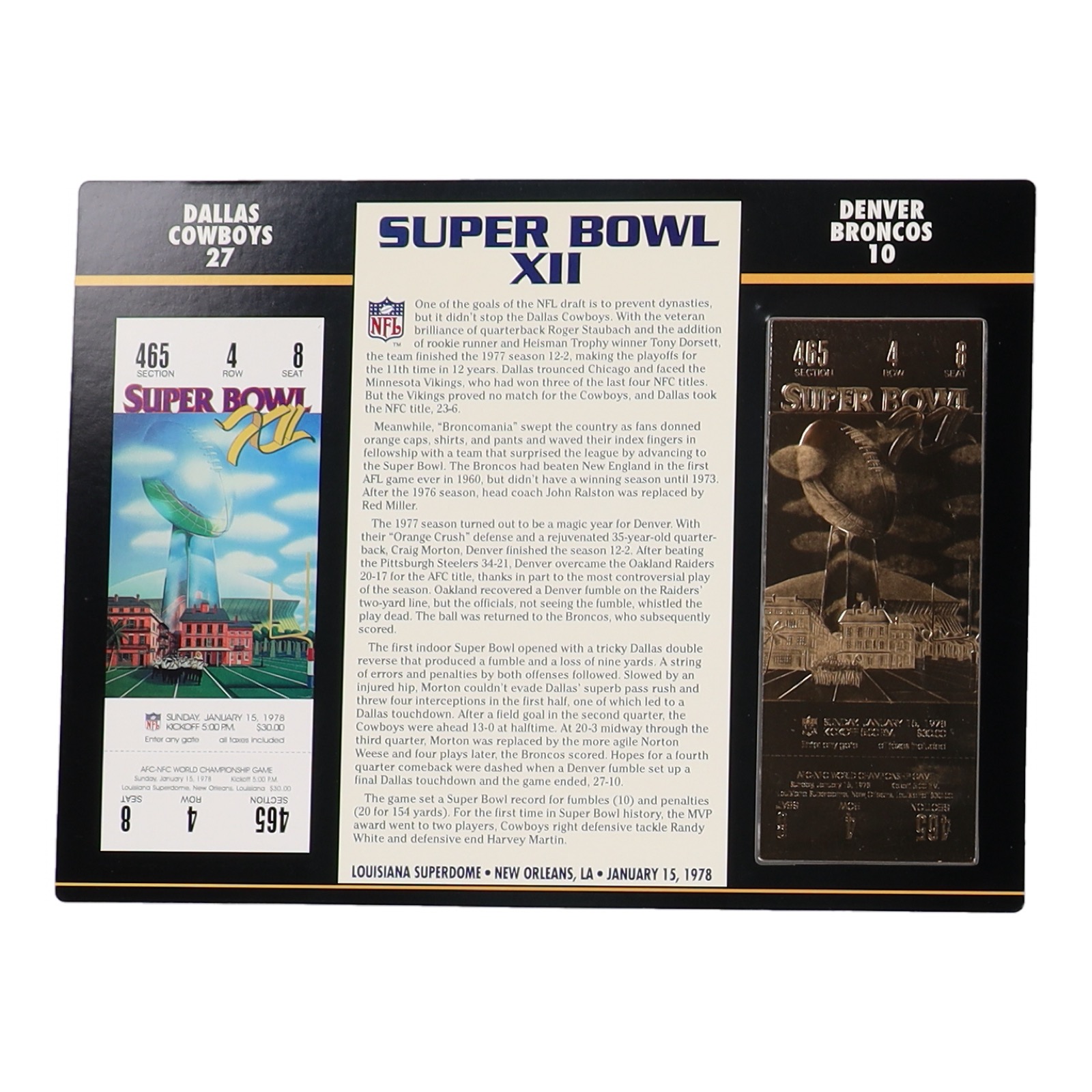 Super Bowl XII Commemorative 9x12 Score Card Display with 22KT Gold Ticket