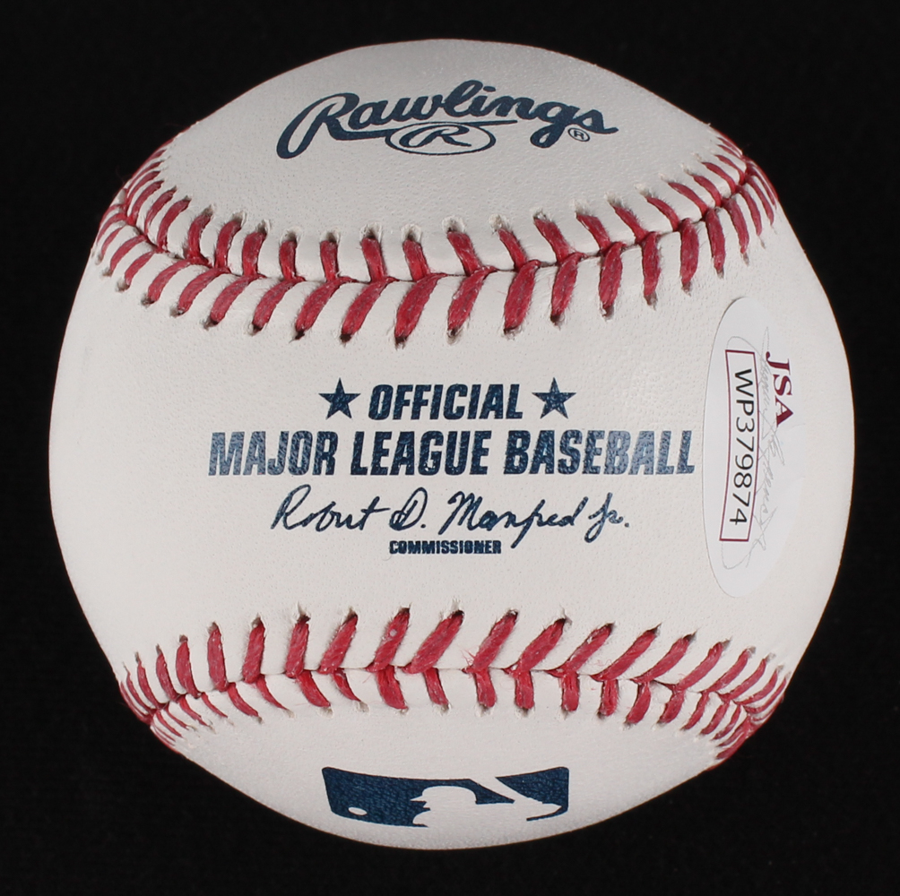Rawlings Official Major League Baseball is hand-signed and inscribed in blue ink pen by Reggie Jackson (Yankees, Athletics HOF). Please note, baseball has slight staining.