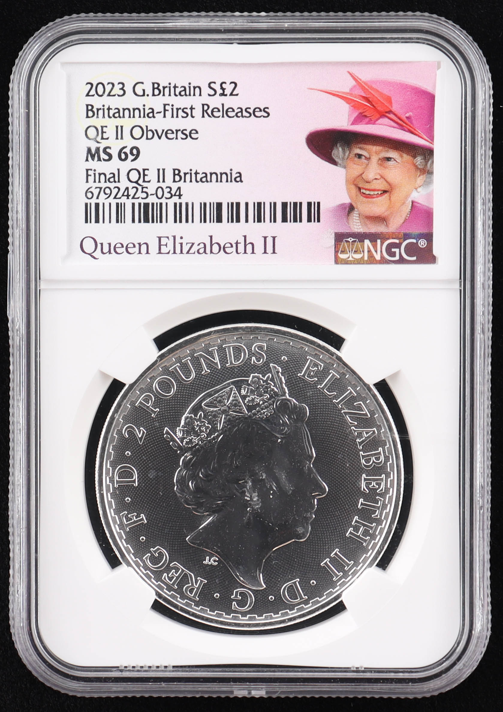 2023 Great Britain 2 Pounds .999 Fine Silver Coin - Britannia First Releases - Queen Elizabeth II Obverse - Final QE II Britannia (NGC MS69)
