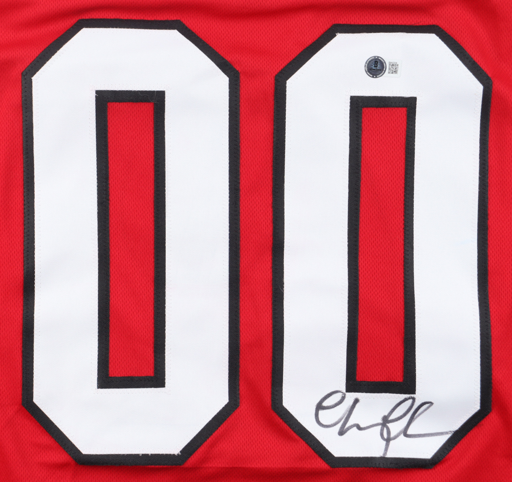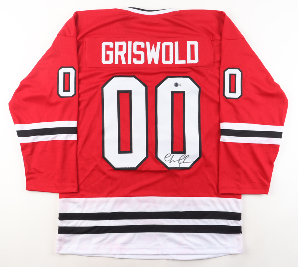 Custom jersey with everything sewn on, size XL. Hand-signed by Chevy Chase (Clark Griswold). Please note, there is red staining at the bottom of the jersey as well as a stain on the reverse number.