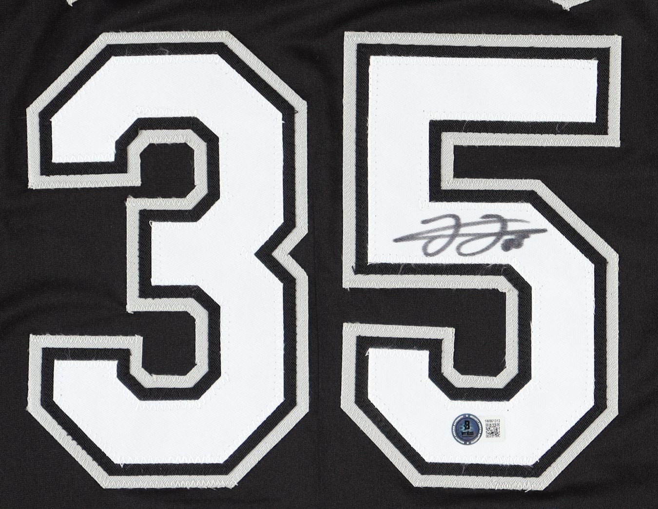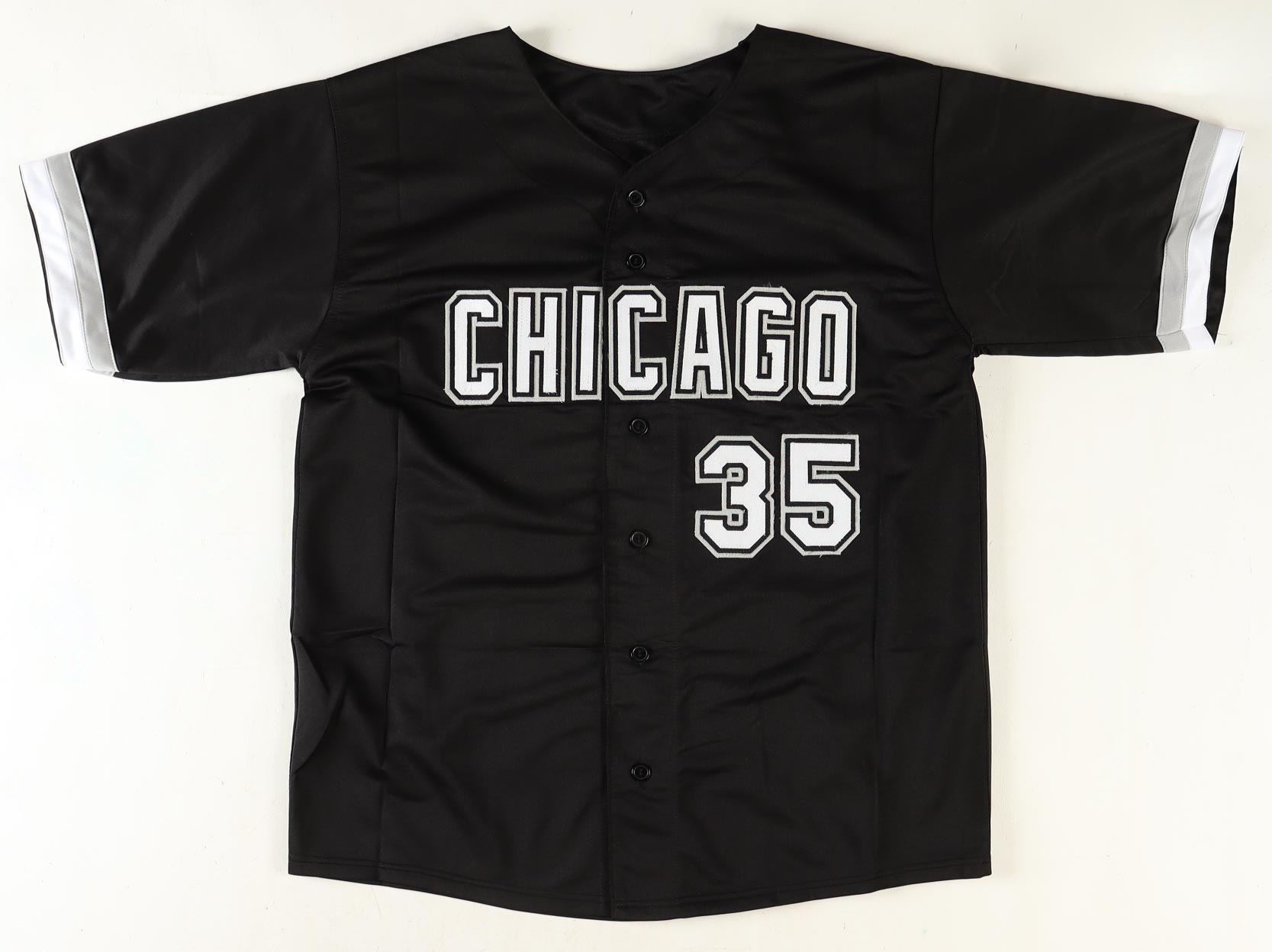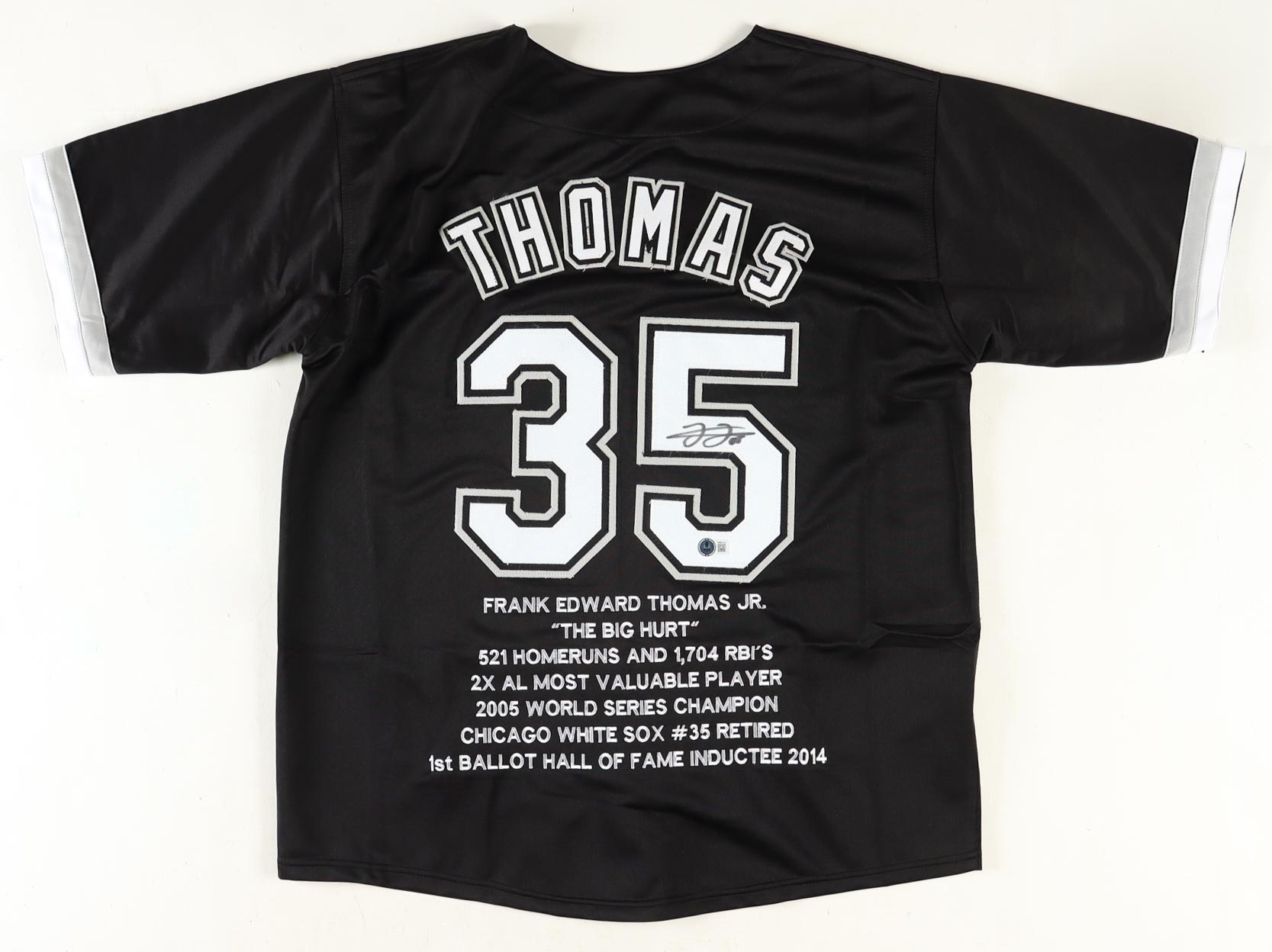Custom jersey. Everything sewn on, size XL. Hand-signed by Frank Thomas (HOF). Frank Thomas's career stats have been stitched onto the reverse side of the jersey.
