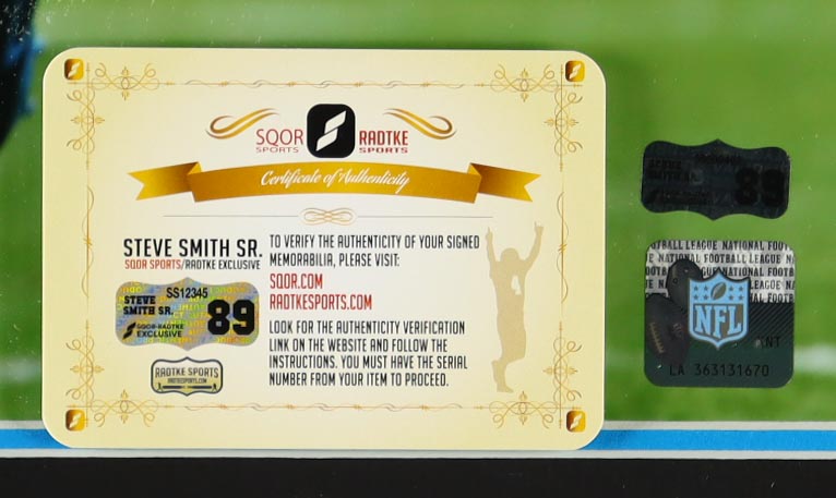 The lot / autograph(s) includes an official exclusive Steve Smith Sr. hologram and COA from Radtke Sports.