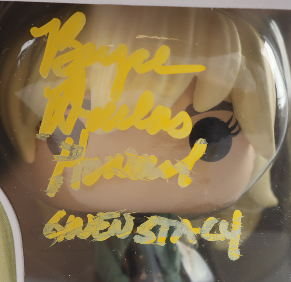 Vinyl figure measures approximately 4" tall. Hand-signed and inscribed on the packaging by Bryce Dallas Howard (Gwen Stacy). Please note, the signature is smudged and the back bottom corners are creased.
