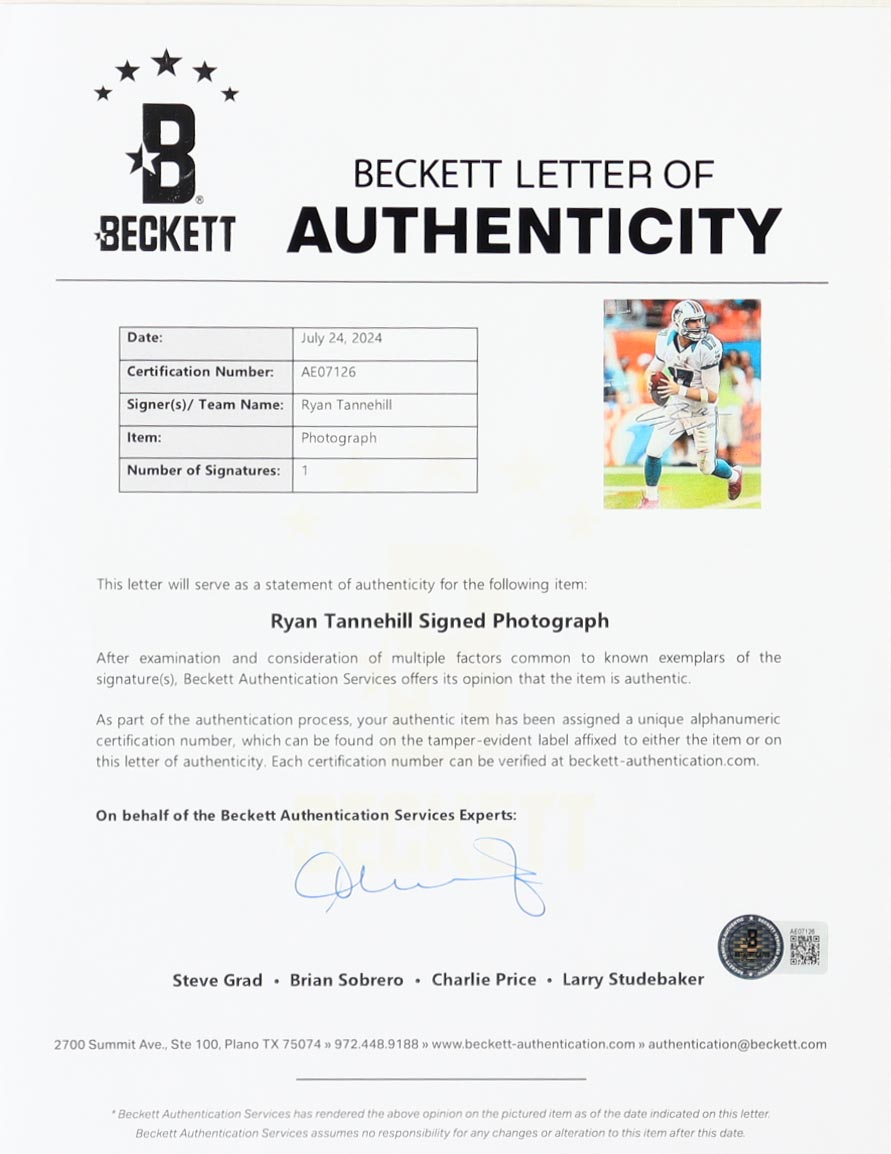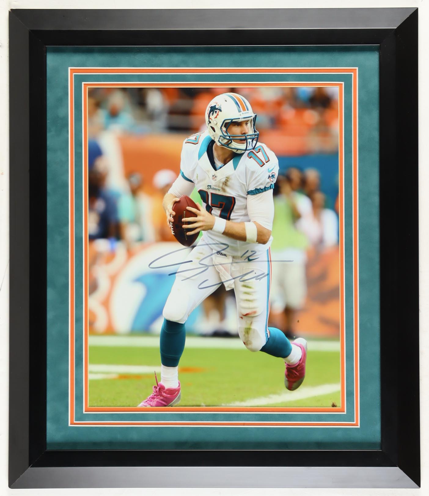 Custom frame measures approximately 24.5” x 28” in size and features a photo that has been hand-signed by Ryan Tannehill (Miami Dolphins). Please note, there is scuffing and corner wear on the frame.