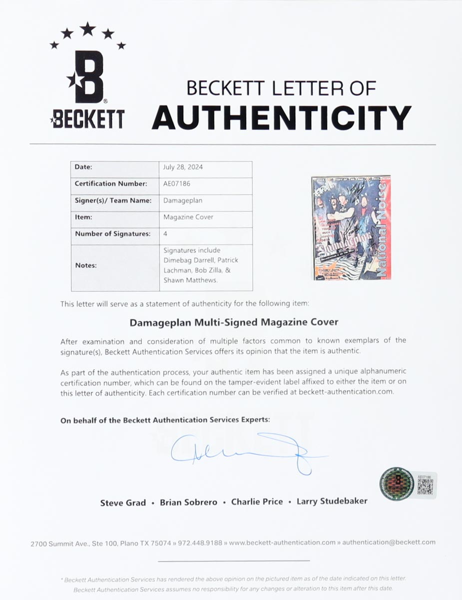 Custom frame measures approximately 19.5" x 22" in size and features a magazine cover that has been hand-signed and inscribed by (4) band members including Dimebag Darrell (D. 2004), Patrick Lachman, Bob Zilla and Shawn Matthews.
