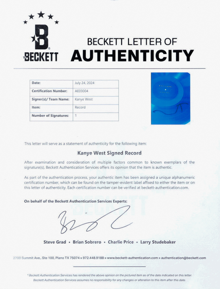 Vinyl record has been hand-signed by Kanye West. Please note, vinyl record album sleeve is not included. Refer to photos for more details on the condition of the item.