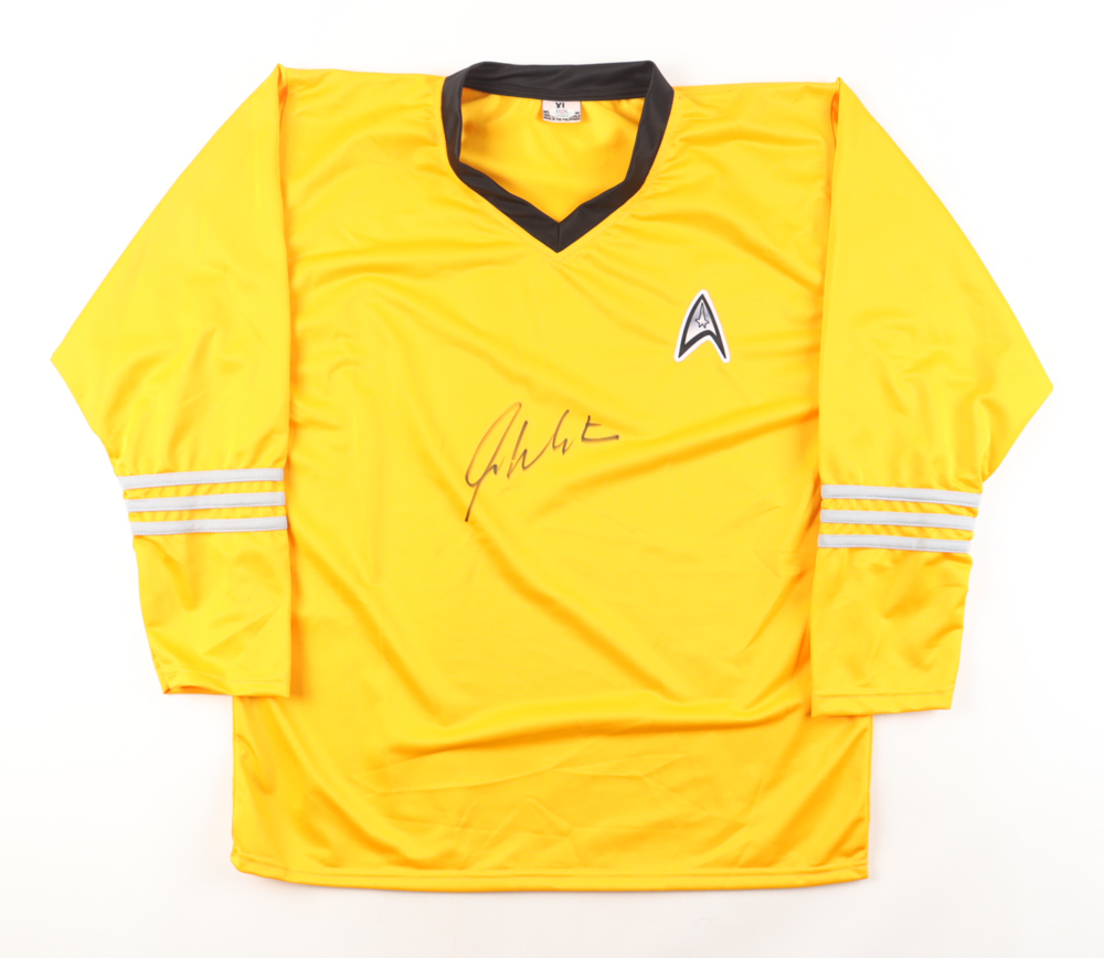 Custom Star Trek uniform with everything sewn on, size XL. Shirt has been hand-signed by William Shatner (Captain James T. Kirk).