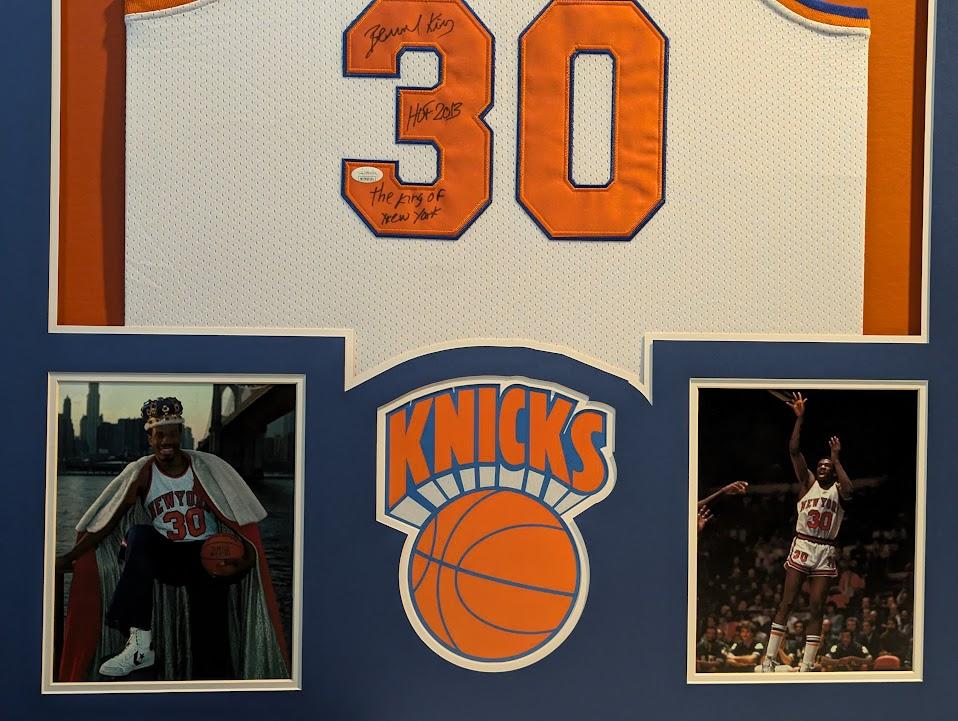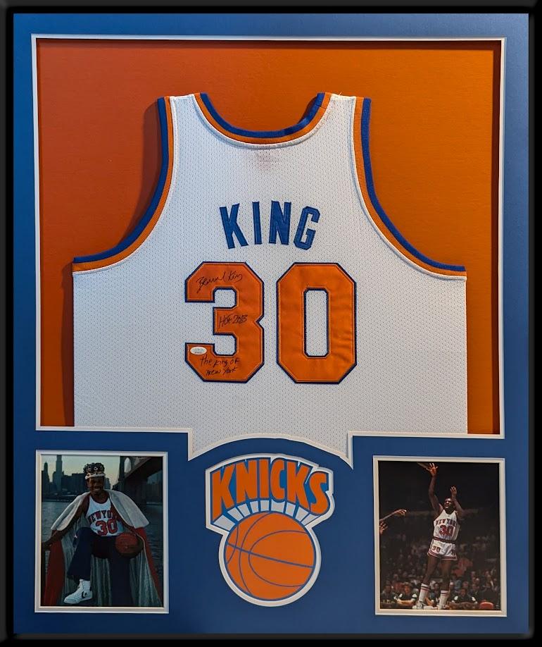 Custom frame measures 34" x 42" in size and features a jersey that has been hand-signed and inscribed by Bernard King (HOF).