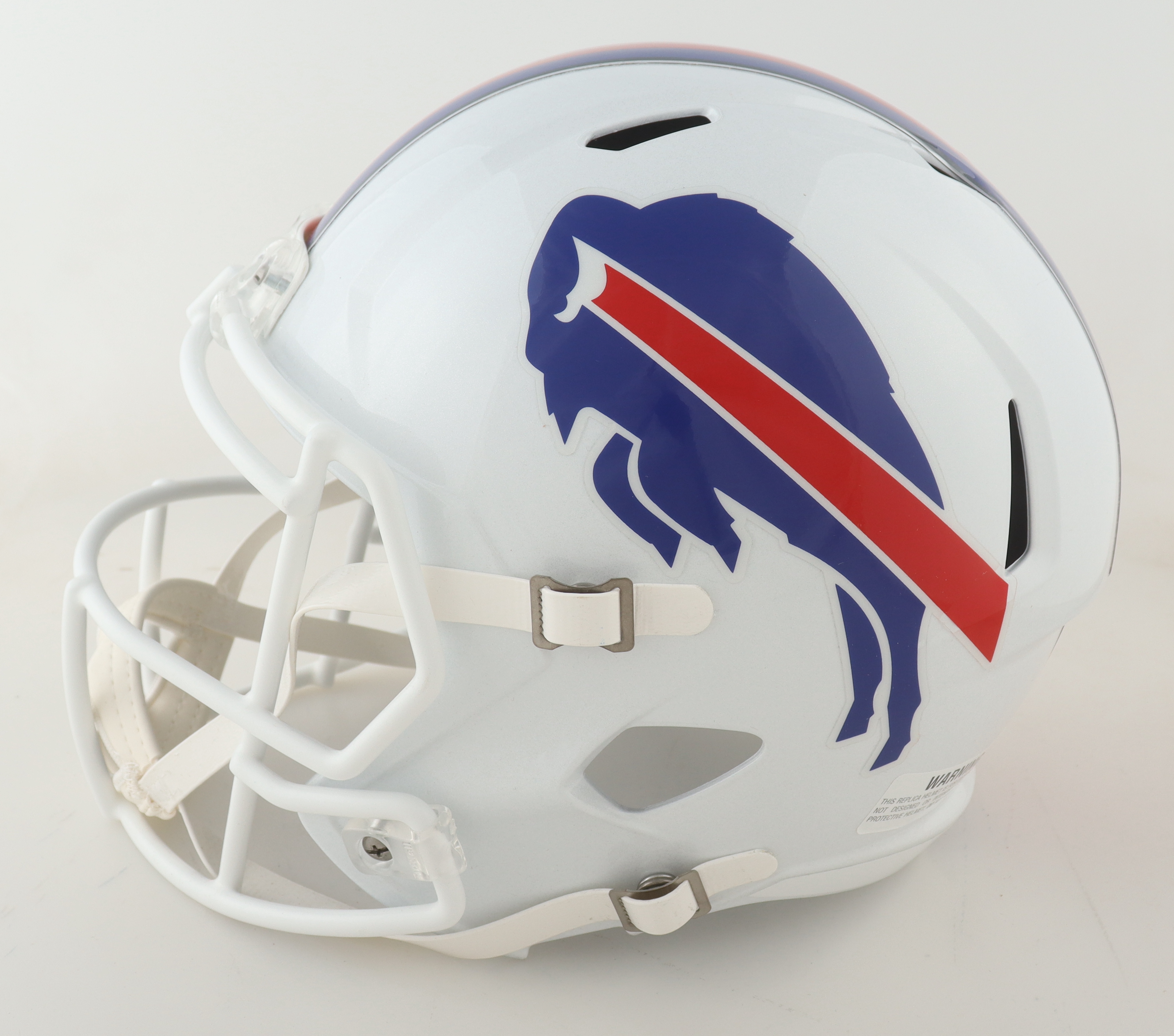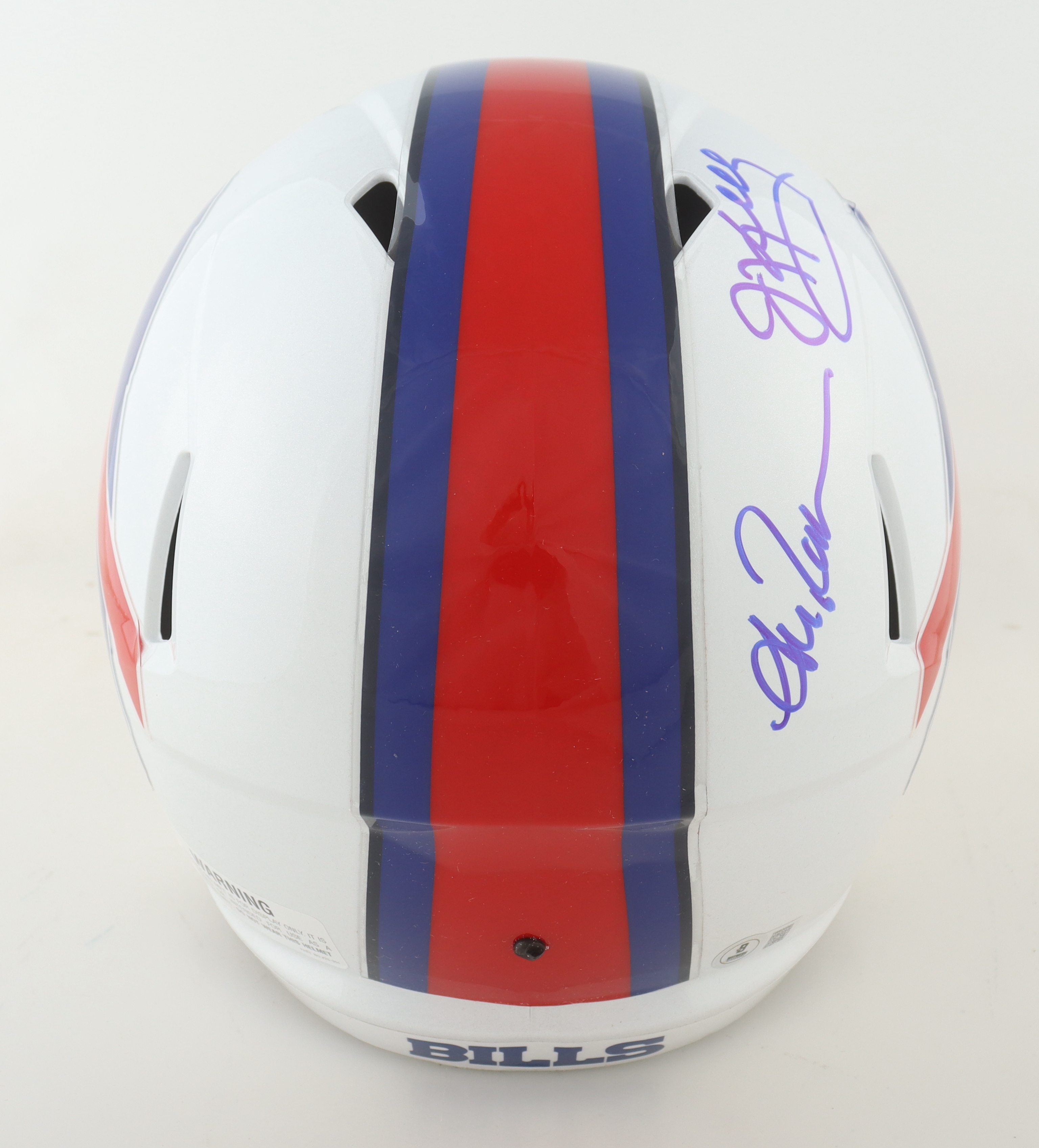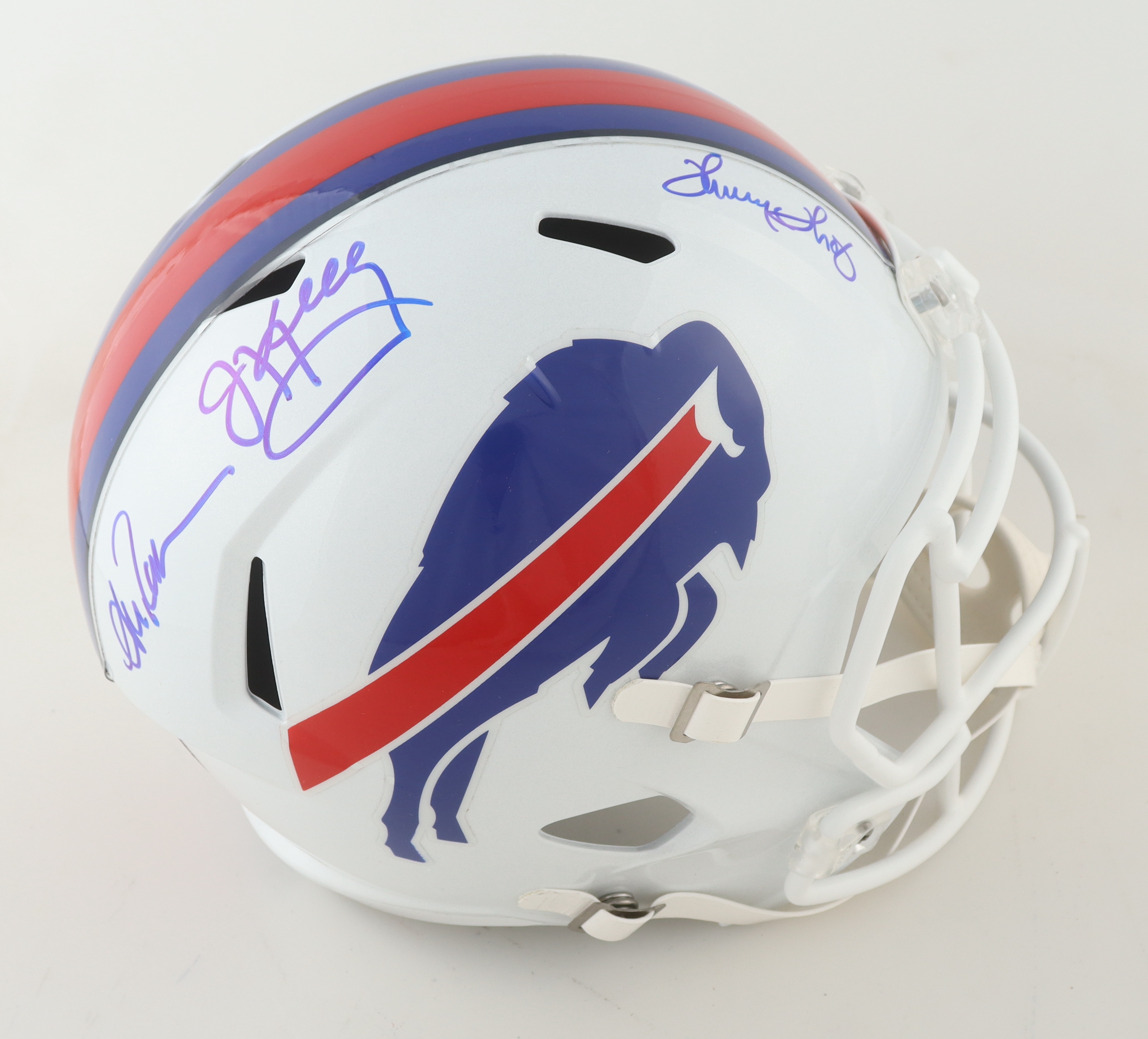 Riddell Buffalo Bills full-size speed replica helmet has been hand-signed by Jim Kelly, Thurman Thomas and Andre Reed (HOF).